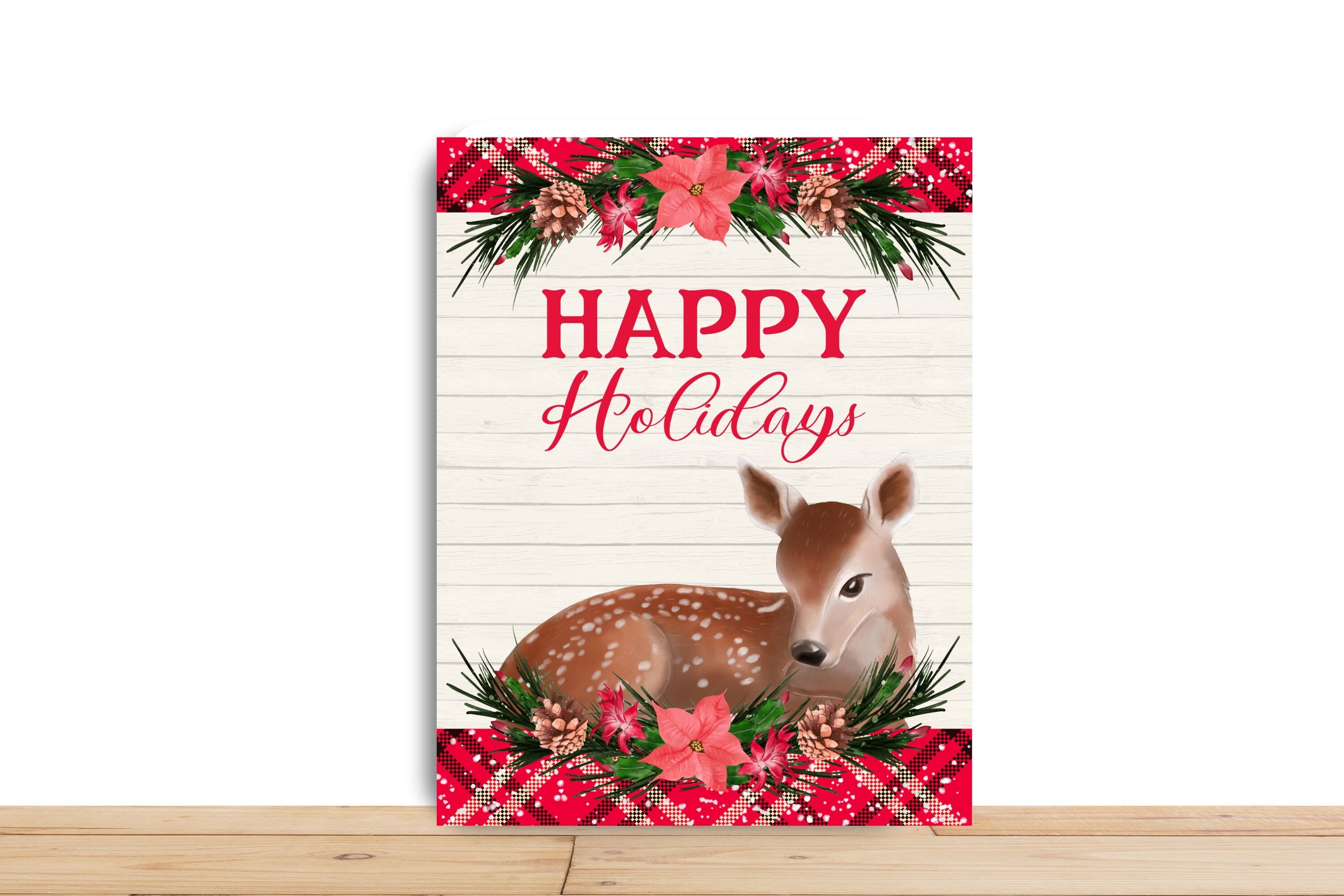 This charming "Happy Holidays" wreath sign features an adorable fawn nestled among festive poinsettias, pinecones, and holiday greenery. The plaid border and rustic wood background create a cozy, farmhouse-style vibe, making it perfect for adding warmth to your Christmas décor. Ideal for wreaths, door signs, or wall art, this sign brings a touch of woodland charm to the holiday season.