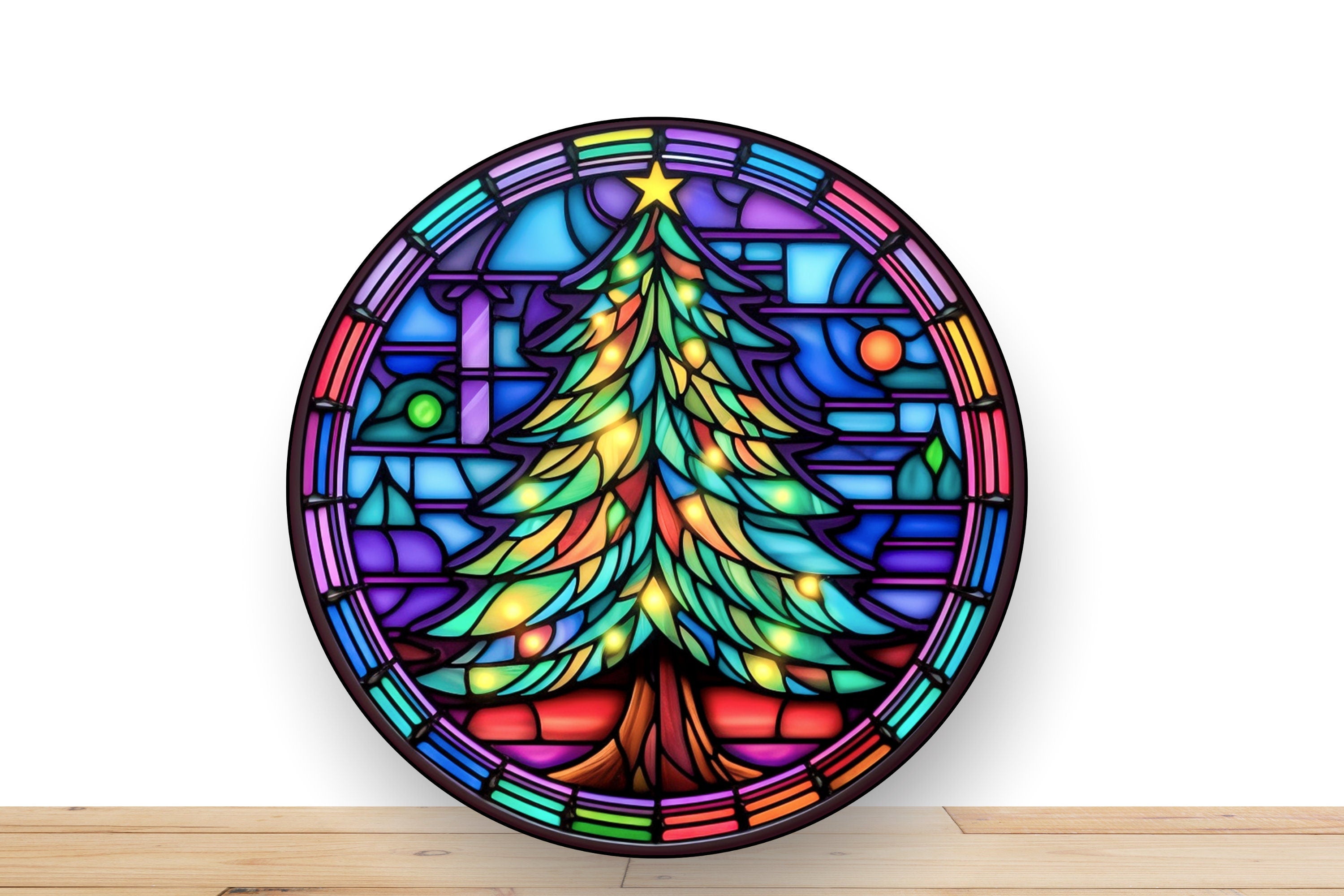 This vibrant wreath sign features a stunning stained glass design of a Christmas tree adorned with colorful lights, topped with a bright star. The intricate details and rich hues of blue, green, purple, and yellow create a beautiful, illuminated effect, making this a unique and artistic addition to any holiday décor. Ideal for Christmas wreaths or as a stand-alone piece, this sign brings the warmth and beauty of the season to life.