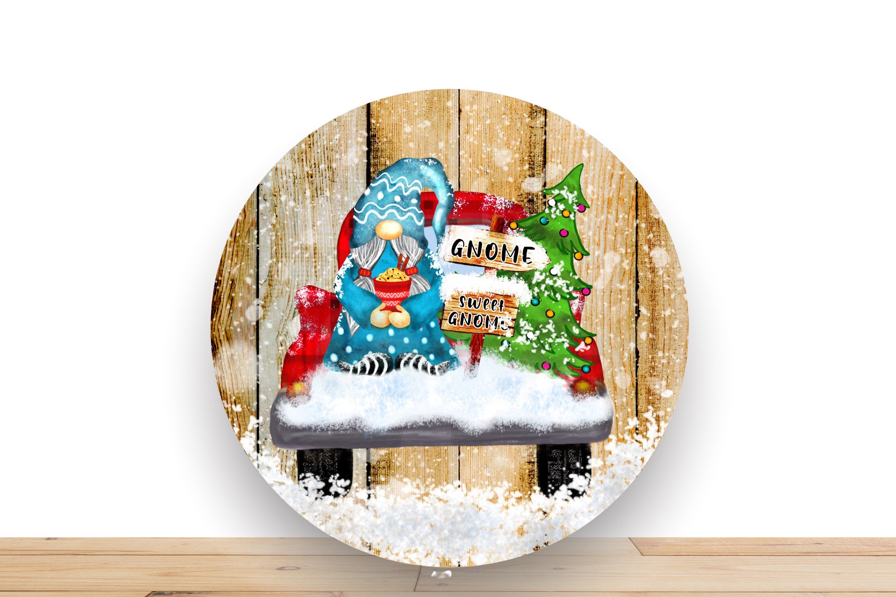 This adorable wreath sign features a cozy winter scene with a festive gnome sitting beside a decorated Christmas tree, holding a bowl of hot cocoa. The rustic wood background and snow-covered accents create a charming holiday feel, while the sign reading "Gnome Sweet Gnome" adds a playful touch. Perfect for wreaths or as a stand-alone decoration, this sign brings warmth and whimsy to your holiday décor.