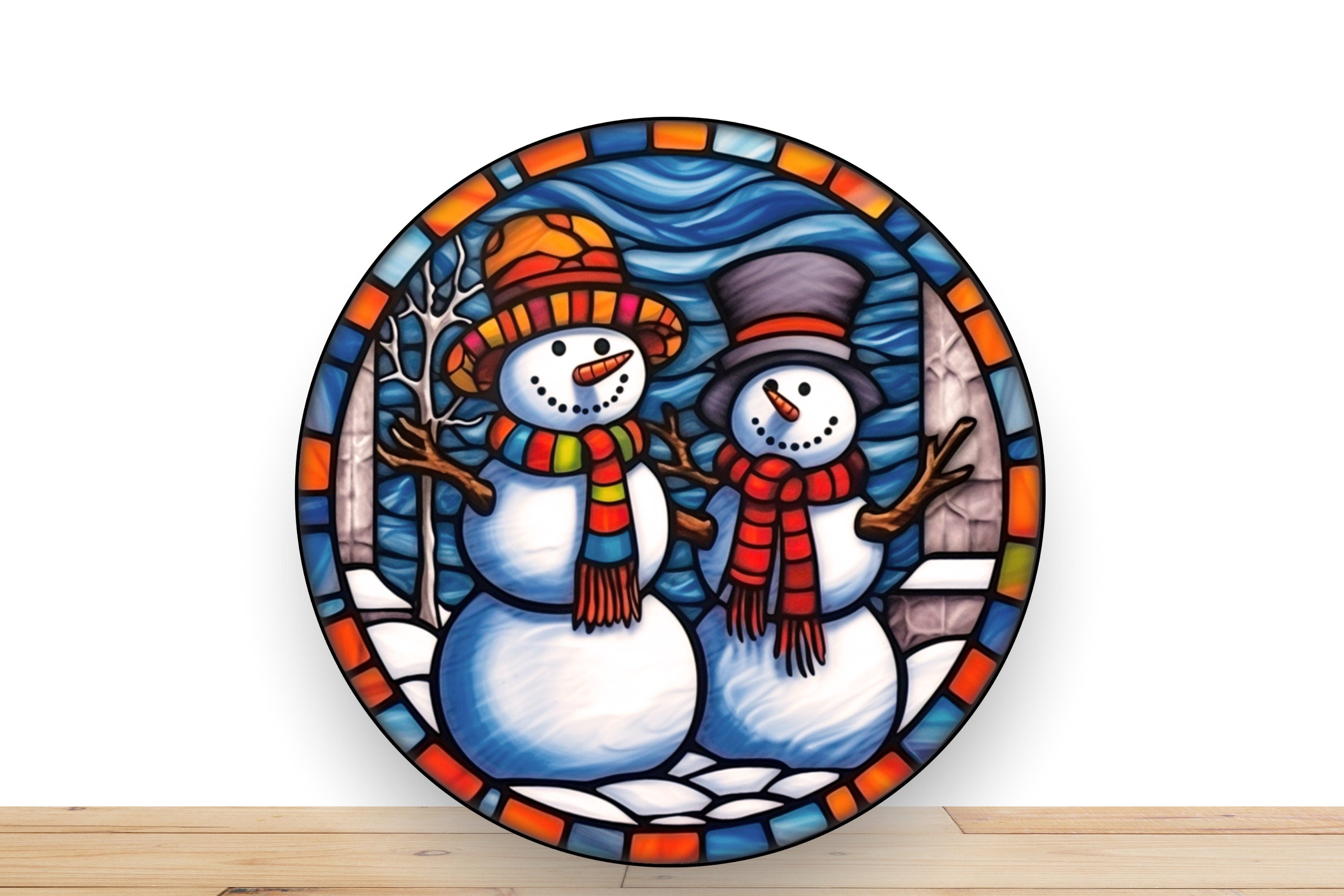 Add a touch of winter magic to your wreath with this vibrant faux stained glass-inspired wreath sign featuring two cheerful snowmen. Perfect for bringing a cozy holiday vibe to your front door or Christmas décor, this sign blends festive charm and timeless style.