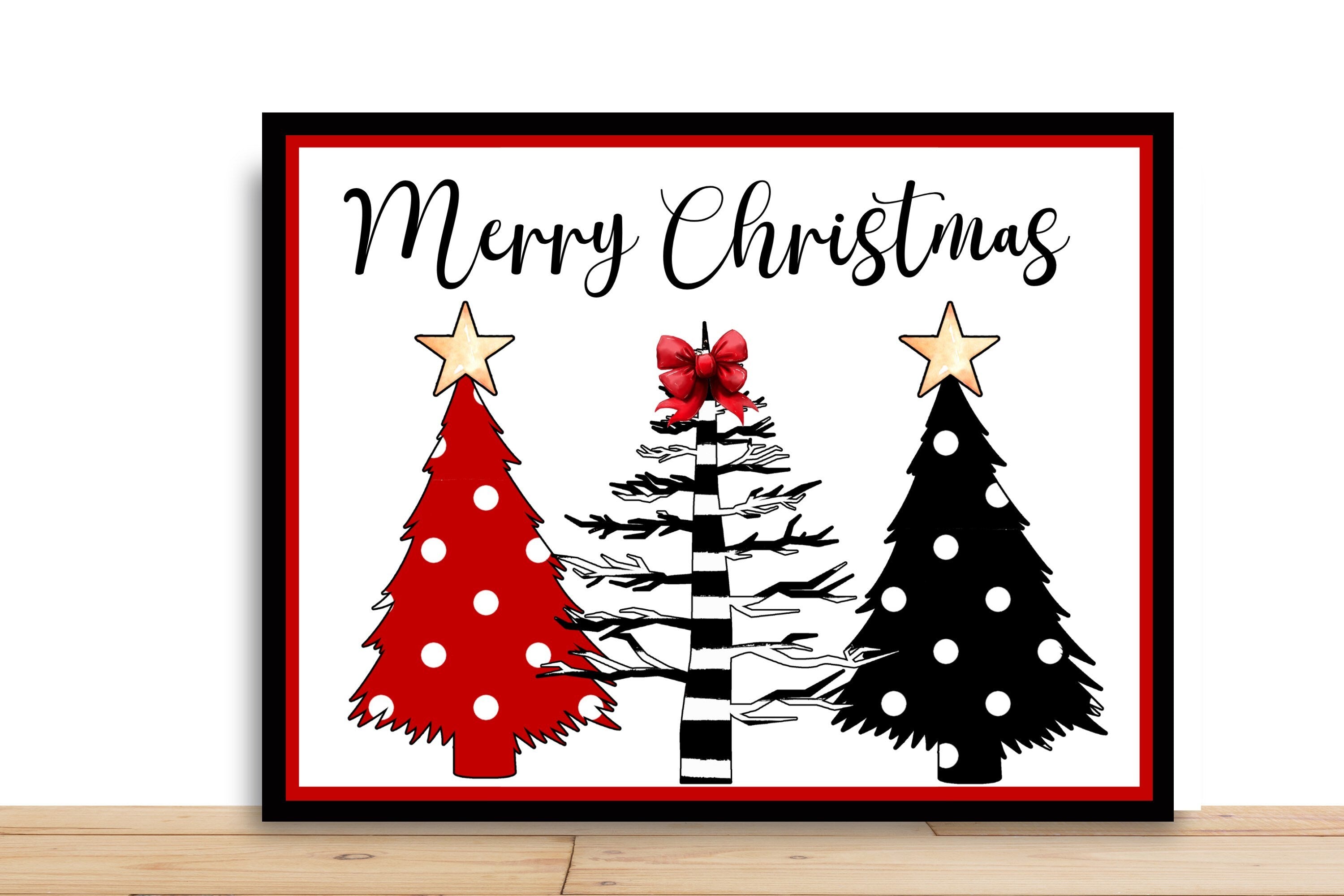 Celebrate the season with this stylish wreath sign featuring a trio of Christmas trees in bold red, black, and striped patterns, topped with stars and a festive bow. This modern take on traditional holiday décor adds a chic touch to your wreath or wall, making it perfect for any contemporary Christmas display.