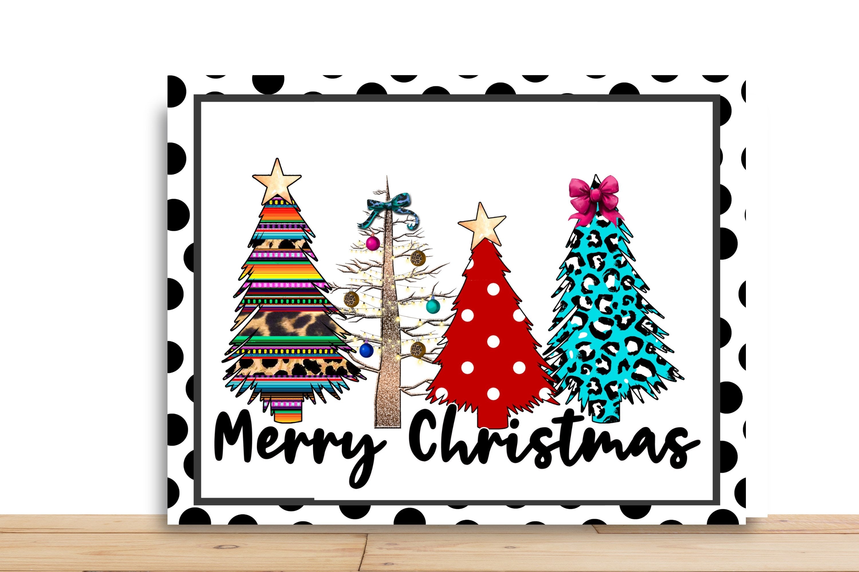 Make your holiday décor pop with this fun and eclectic wreath sign featuring four uniquely styled Christmas trees. From vibrant serape stripes and leopard print to classic red polka dots and a chic teal leopard pattern, this sign adds a splash of personality to your wreath or front door.