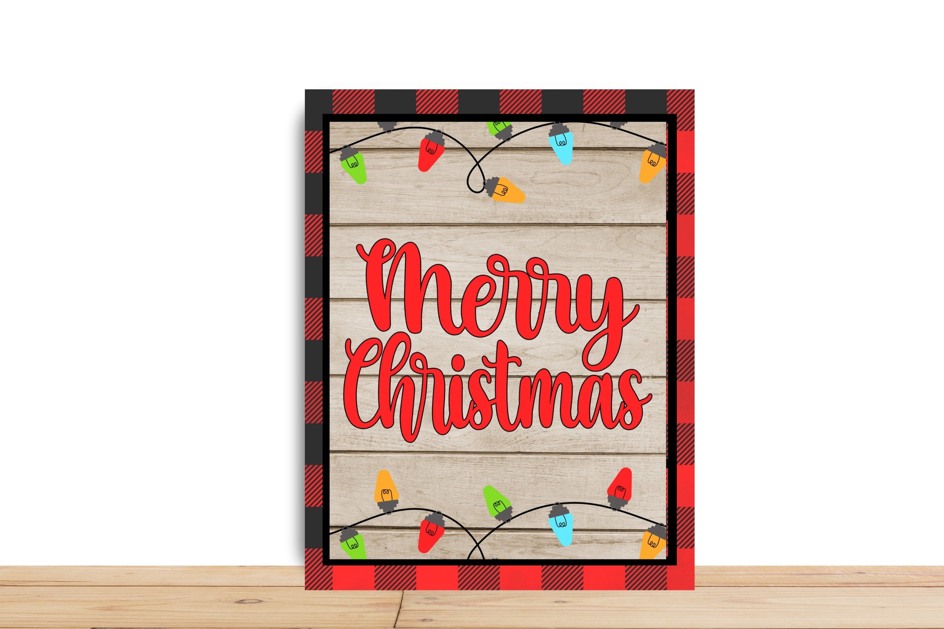 Brighten up your holiday decor with this cheerful wreath sign showcasing a "Merry Christmas" message accented with colorful string lights. The rustic wood background and buffalo plaid border make this sign a delightful addition to your Christmas decorations.
