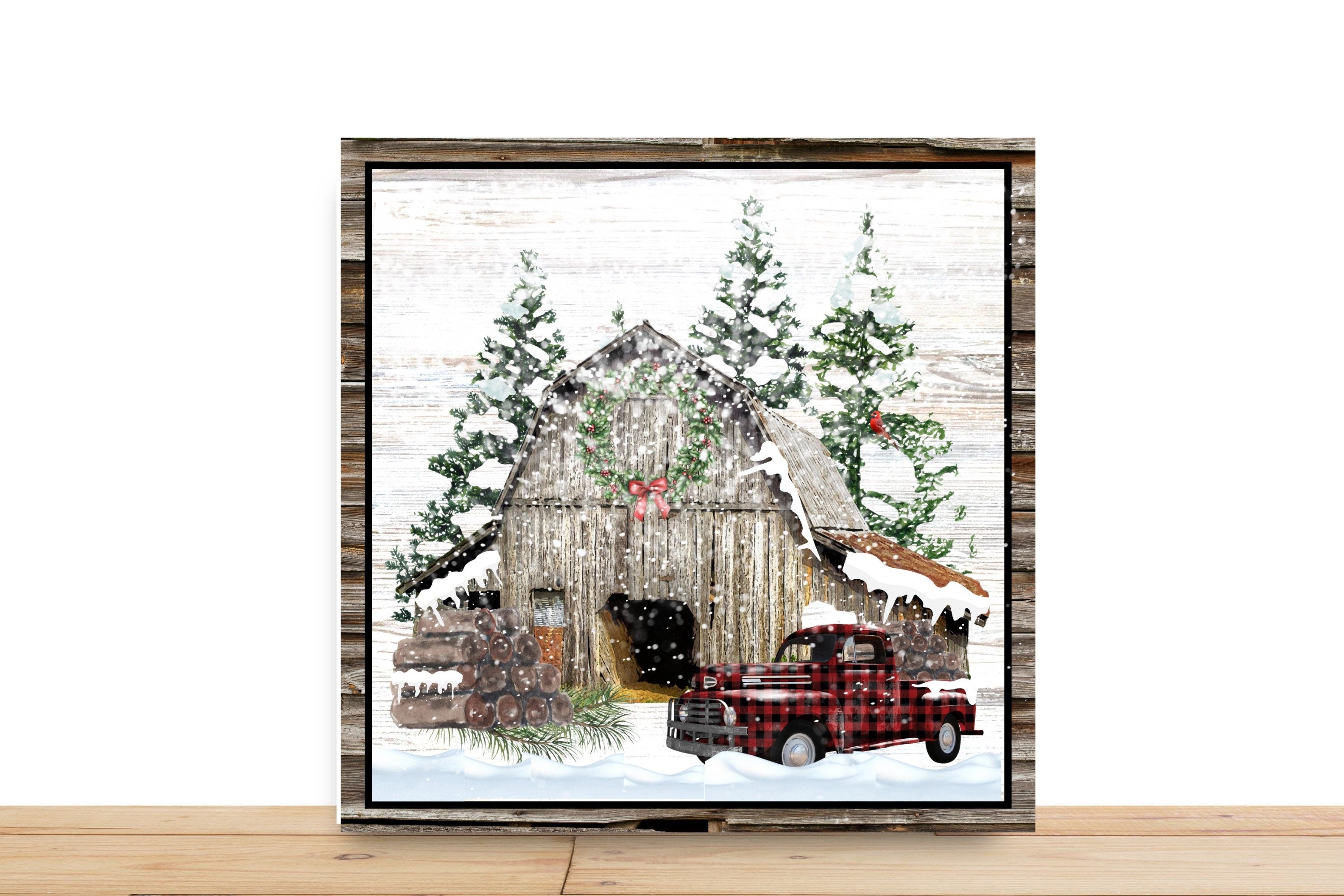 Cozy up your wreaths with this rustic winter barn sign featuring a weathered wood barn, snow-covered pine trees, a festive wreath, and a classic red buffalo plaid pickup truck. It’s the perfect touch of farmhouse charm for holiday or winter décor lovers!