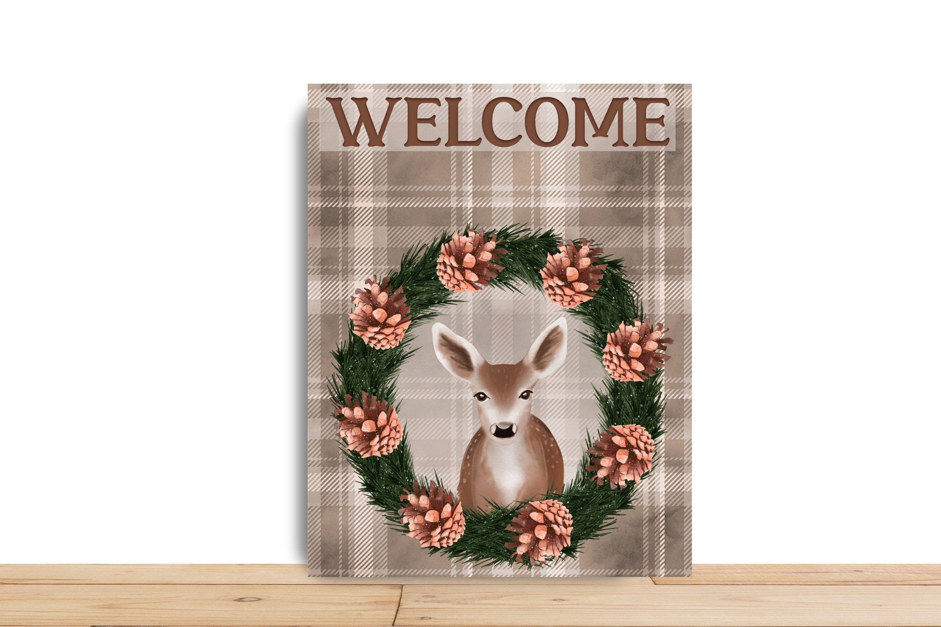 Add a cozy woodland charm to your home with this plaid “Welcome” sign featuring a sweet deer nestled in a pinecone and evergreen wreath. A perfect blend of rustic winter warmth and forest whimsy—ideal for front doors, cabins, or holiday wreaths.
