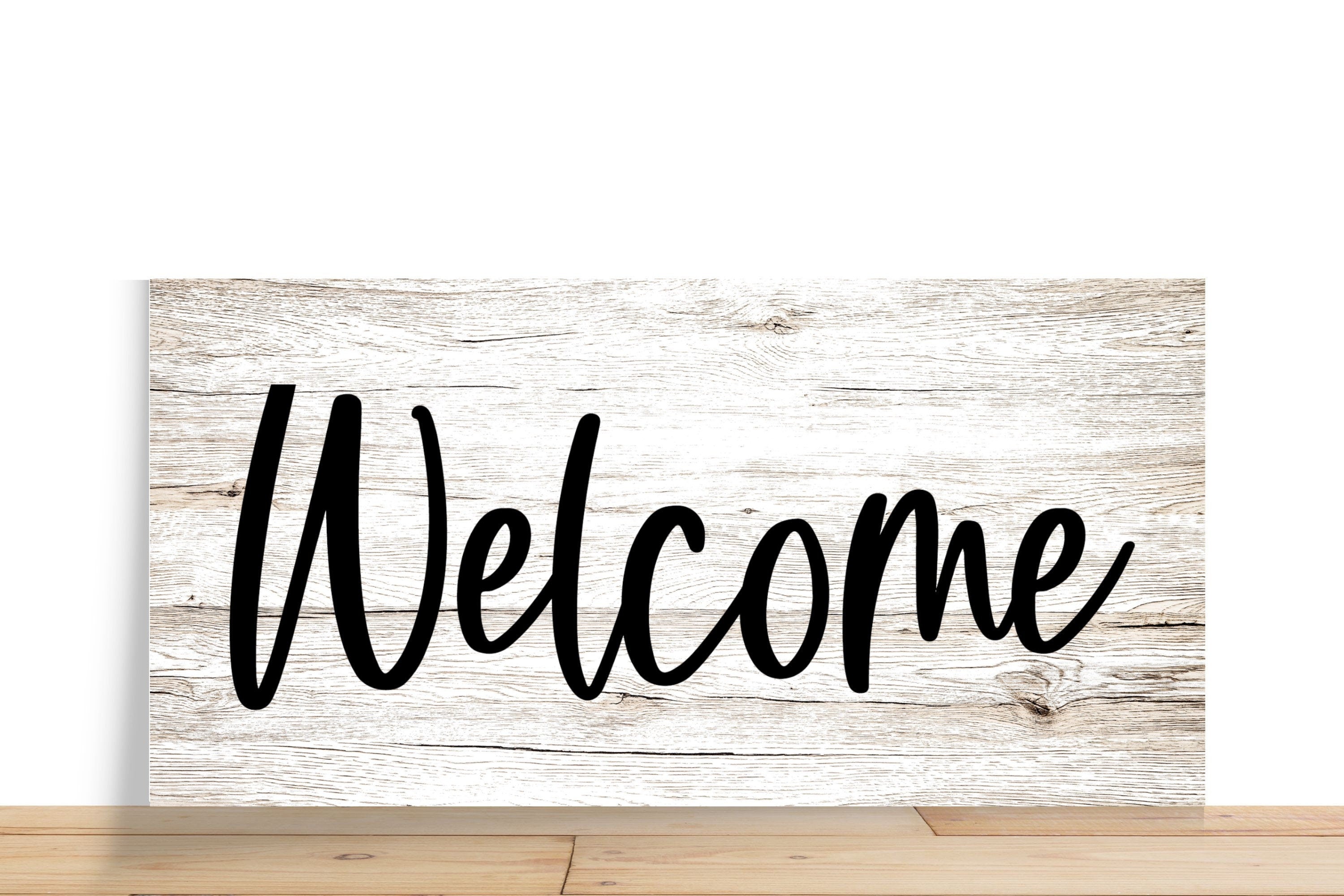 Elevate your entryway or home decor with this minimalist "Welcome" wreath sign. Featuring bold black lettering on a rustic white wood background, this versatile sign adds a touch of farmhouse charm to any space.