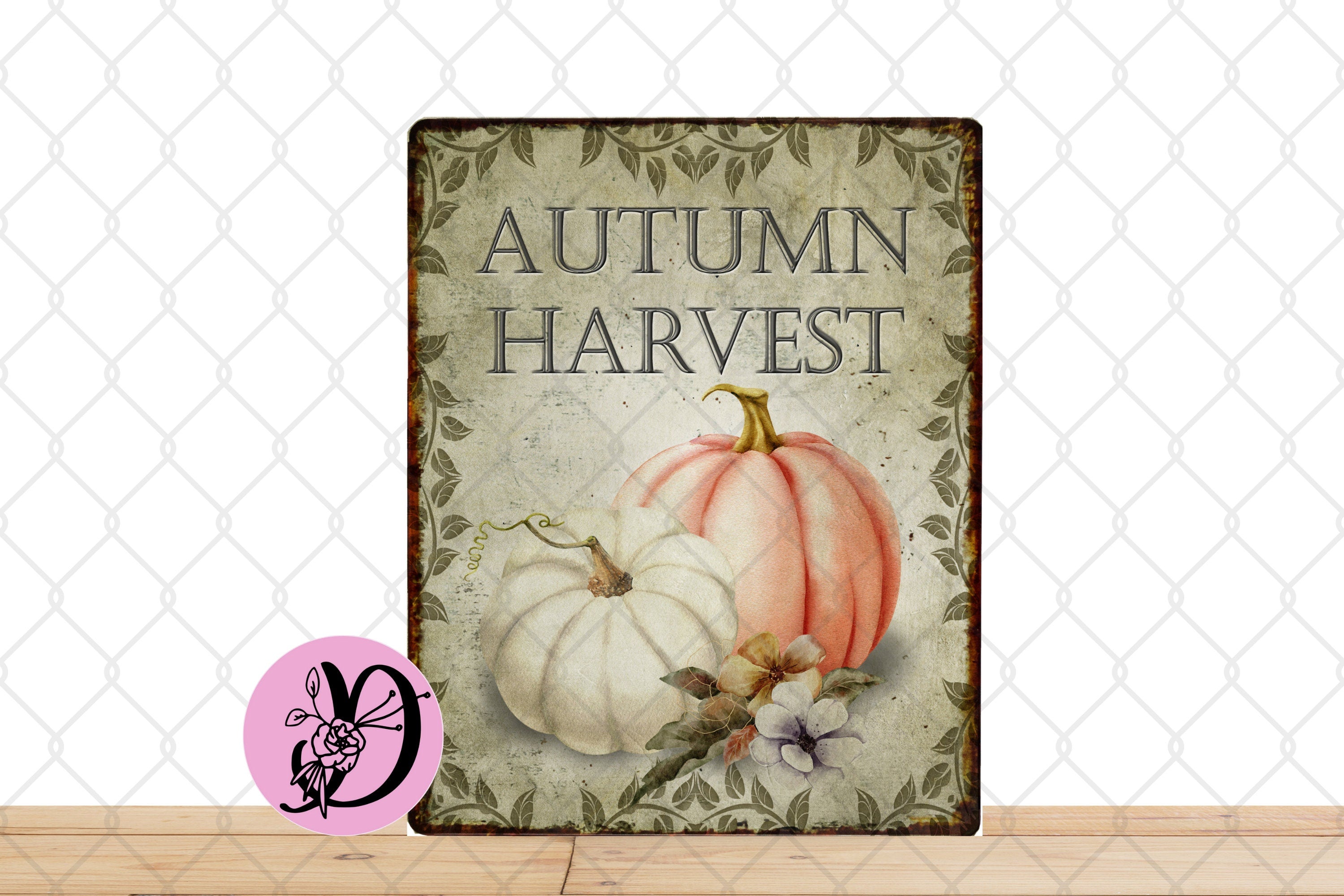 Bring vintage charm to your wreaths and fall decor with this “Autumn Harvest” sign featuring soft watercolor pumpkins, floral accents, and a distressed background. A perfect touch for farmhouse-style fall wreaths and rustic Thanksgiving decorating.