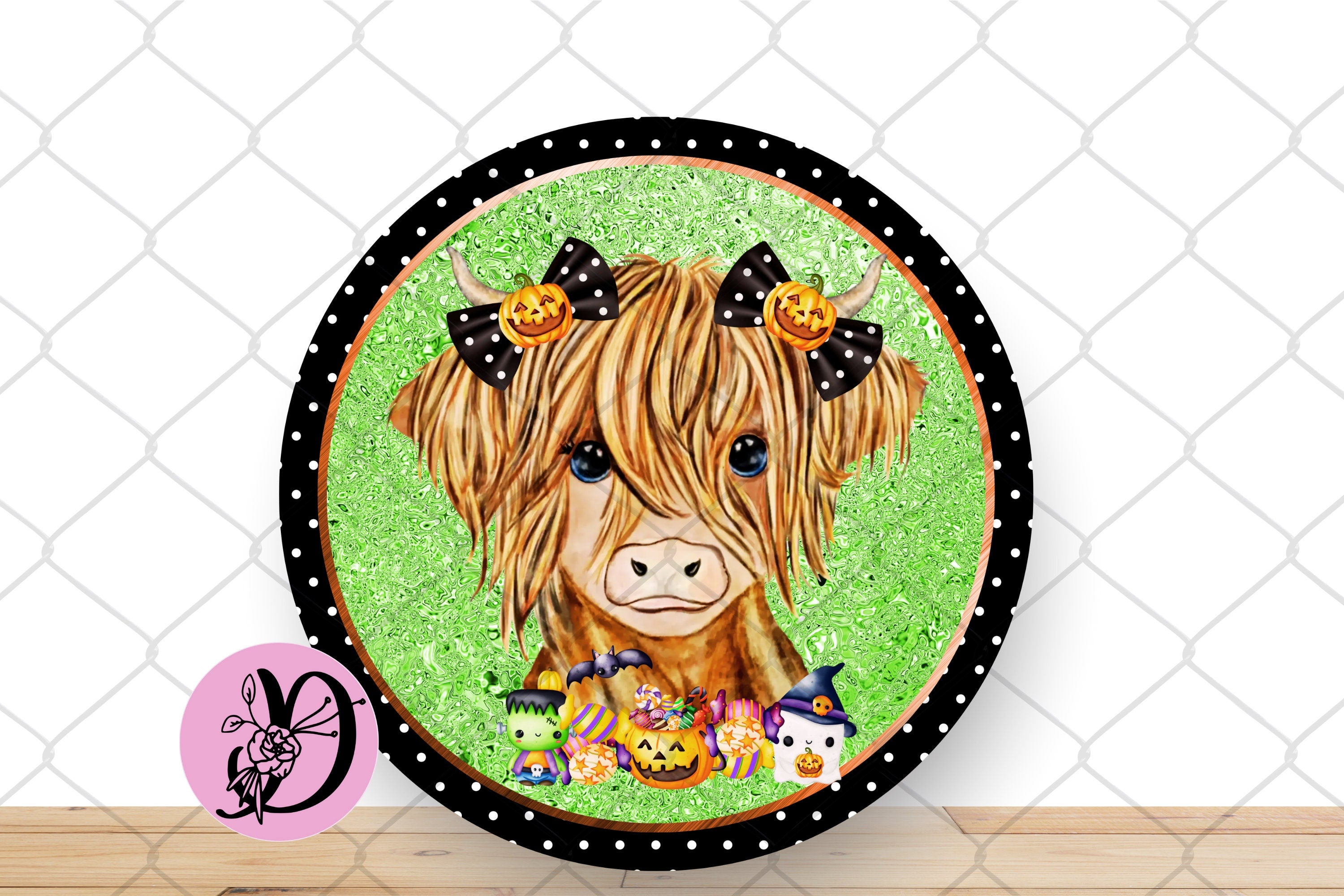 This fun and festive wreath sign features a cute Highland cow dressed up for Halloween, complete with two bows adorned with jack-o'-lanterns. The cow is surrounded by a playful display of Halloween elements like a jack-o'-lantern, candies, a mini Frankenstein, and a ghost. Set against a vibrant green background with a dotted border, this sign adds a touch of spooky charm to your Halloween décor while maintaining a whimsical country feel.