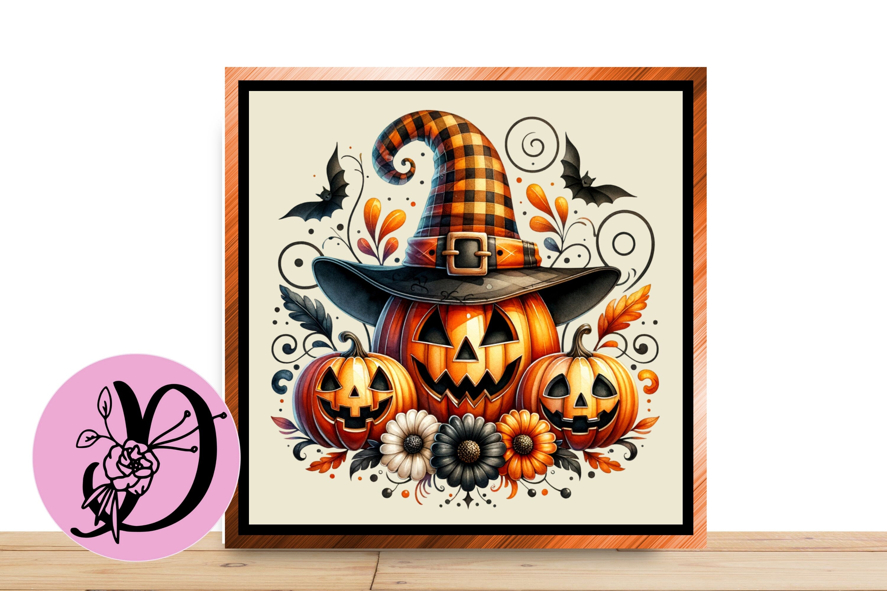 Add a festive Halloween touch to your décor with this stunning jack-o'-lantern wreath sign! Featuring a smiling pumpkin wearing a checkered witch hat, surrounded by spooky bats, autumn florals, and swirling accents, this sign is perfect for Halloween wreaths, seasonal door decorations, and haunted house displays.