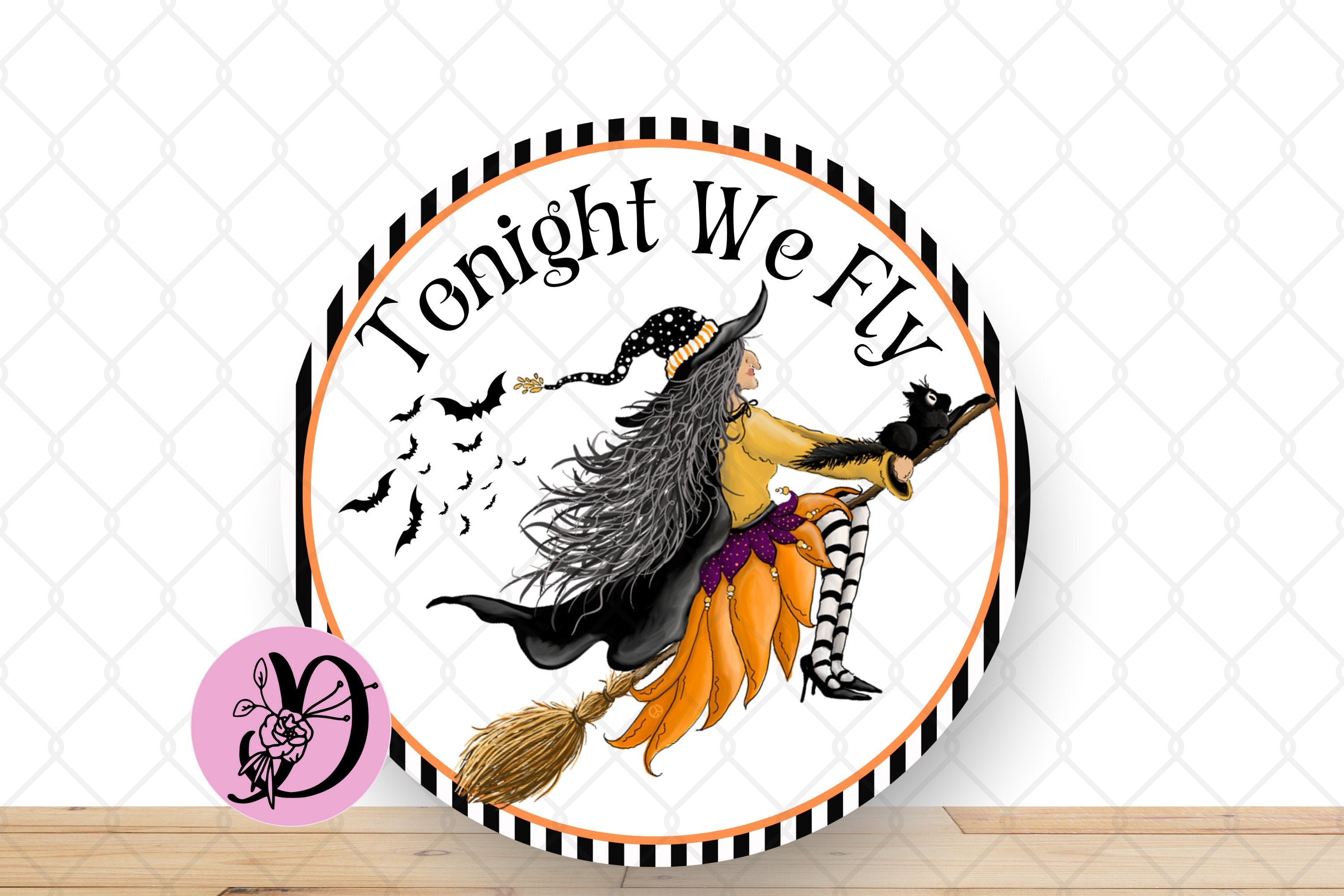Add a whimsical and spooky touch to your Halloween décor with this "Tonight We Fly" wreath sign! Featuring a stylish witch flying on her broomstick with a black cat, surrounded by bats, and framed with a classic black and orange striped border, this sign is perfect for witchy Halloween wreaths, festive door décor, and seasonal displays.