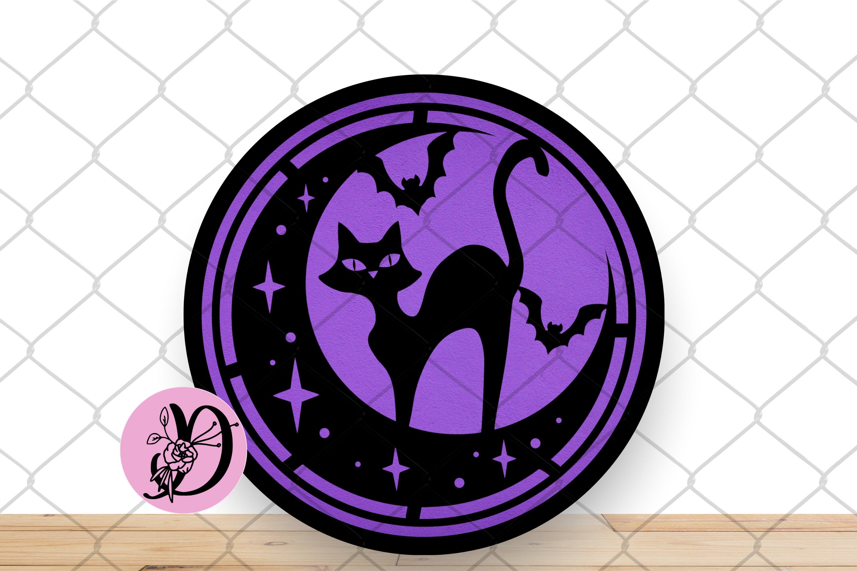 Add a mystical and spooky touch to your Halloween décor with this striking black cat wreath sign! Featuring a sleek black cat silhouette perched on a crescent moon, surrounded by bats and stars against a deep purple background, this sign is perfect for witchy Halloween wreaths, gothic décor, and enchanting seasonal displays.