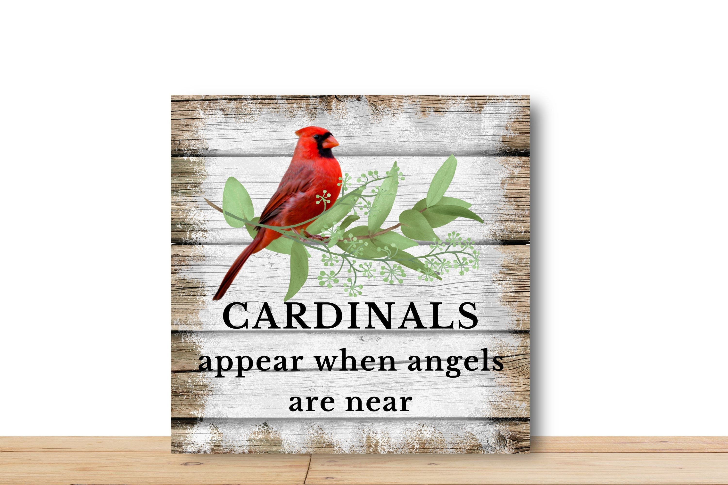 This heartwarming "Cardinals Appear When Angels Are Near" sign is a beautiful tribute to loved ones who are missed. Featuring a vibrant red cardinal perched among soft greenery against a rustic wood backdrop, it brings a peaceful, comforting touch to any home or wreath. The distressed wood look adds a cozy, vintage charm, making this sign a meaningful decoration for those who find comfort in this touching sentiment.