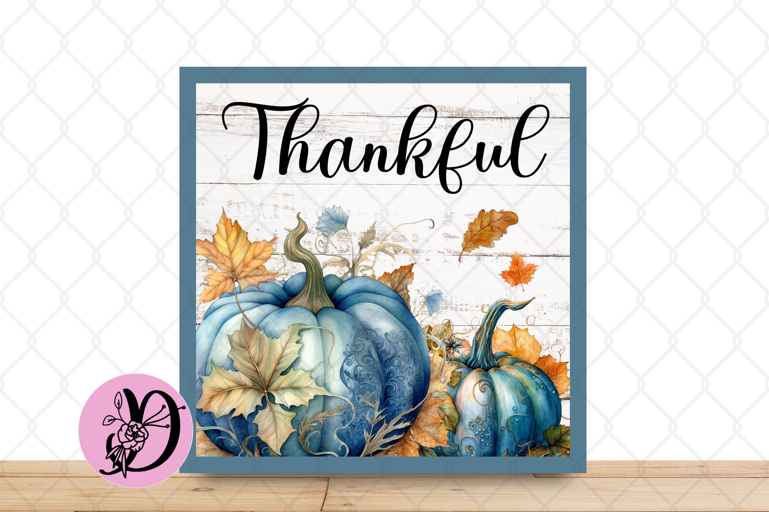 Add a soft, cozy touch to your fall wreaths with this “Thankful” wreath sign featuring dreamy blue pumpkins, falling leaves, and rustic farmhouse vibes. Perfect for Thanksgiving, fall front door decor, or seasonal centerpieces.