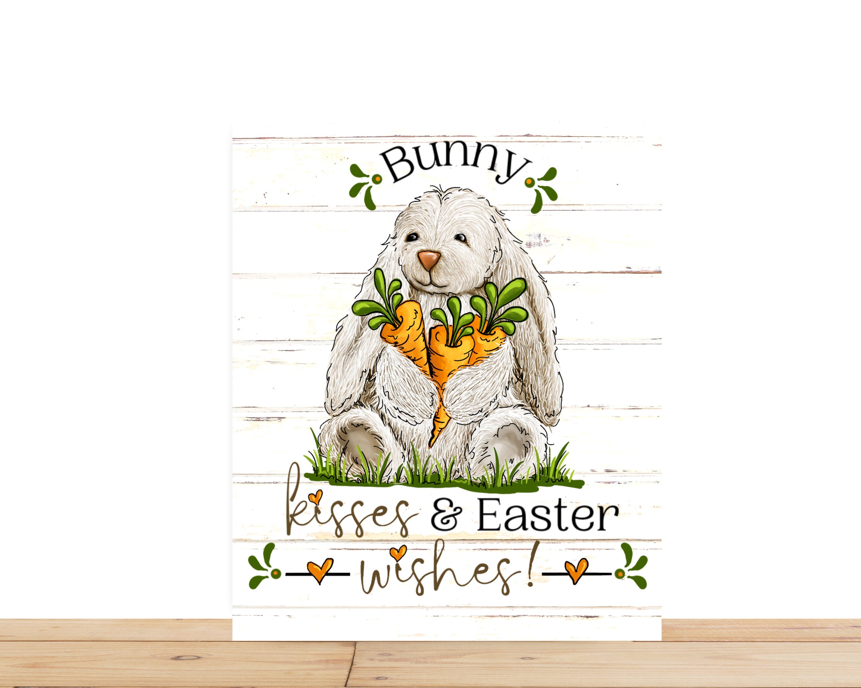Spread Easter cheer with this adorable wreath sign featuring a fluffy bunny hugging vibrant carrots and a sweet message of "Bunny Kisses & Easter Wishes." Perfect for farmhouse-style spring decor or as a festive addition to your Easter celebrations.