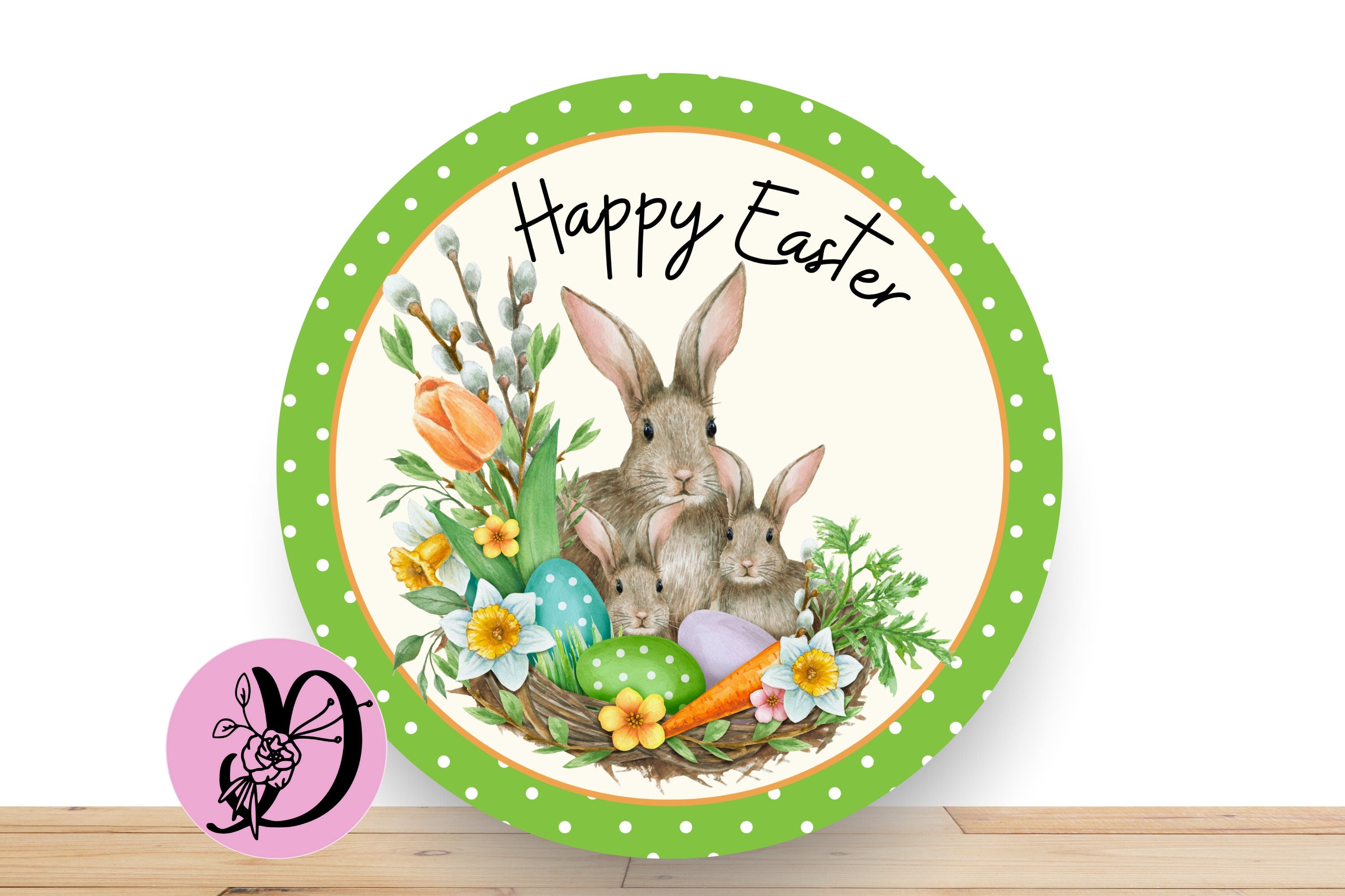 Celebrate Easter with this delightful wreath sign featuring a charming bunny family nestled among colorful eggs, spring flowers, and a carrot. The green polka-dot border adds a cheerful touch, making it a perfect addition to your seasonal decor.