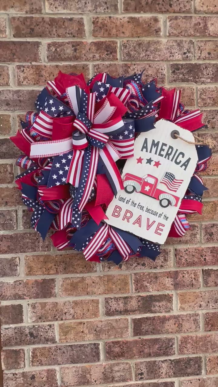 Celebrate freedom in classic American style with this handmade patriotic wreath featuring a rustic red truck tag sign that reads: "America – Land of the Free Because of the Brave." 🇺🇸