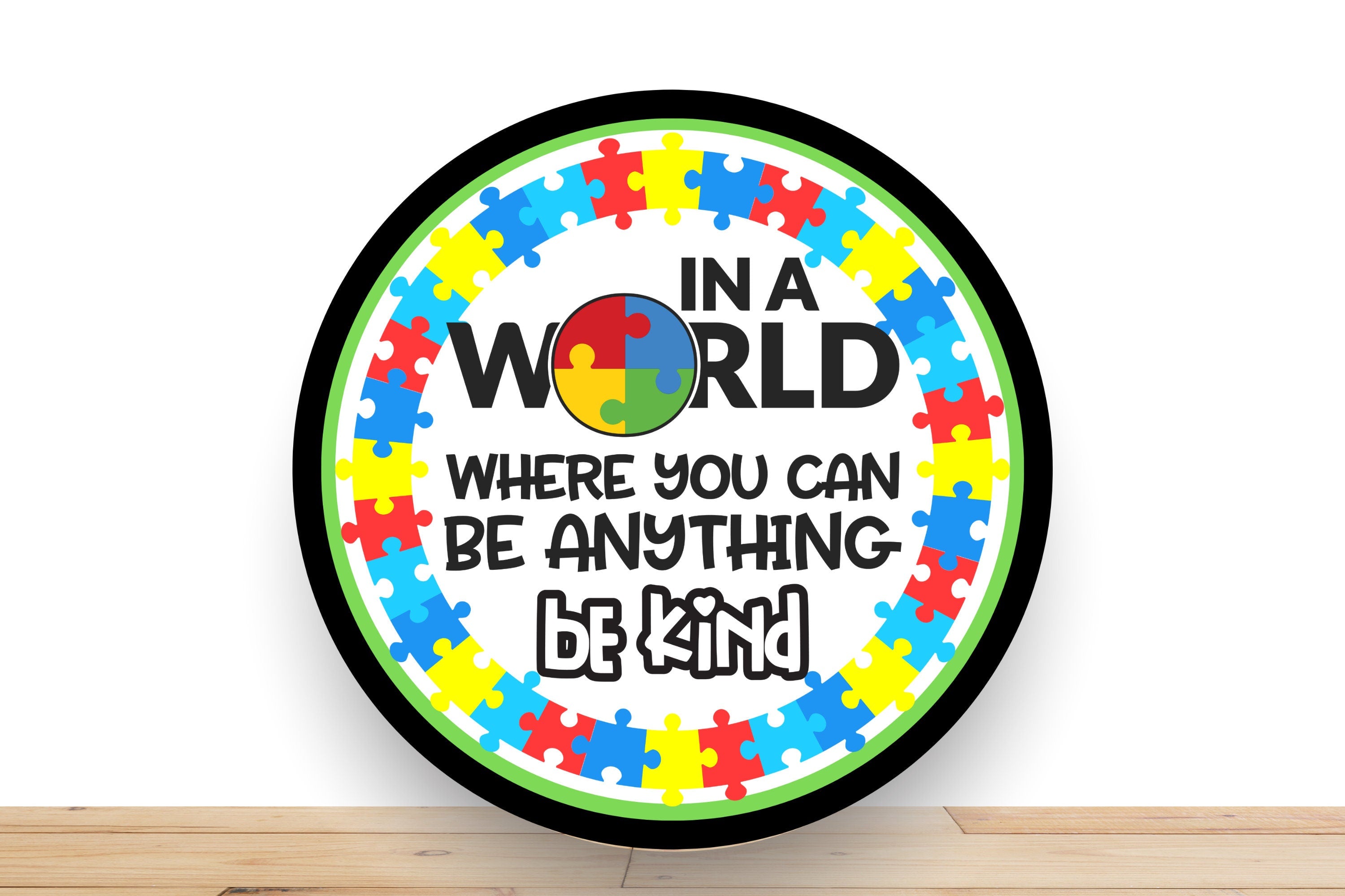 Spread kindness and raise awareness with this beautiful round Autism wreath sign. Featuring a vibrant puzzle piece border and the heartwarming message, ‘In a world where you can be anything, be kind,’ this sign is perfect for showcasing support for the autism community. The bright colors and meaningful design will stand out in any wreath or home decor, making it a wonderful reminder to choose kindness every day. Perfect for Autism Awareness Month or year-round displays!
