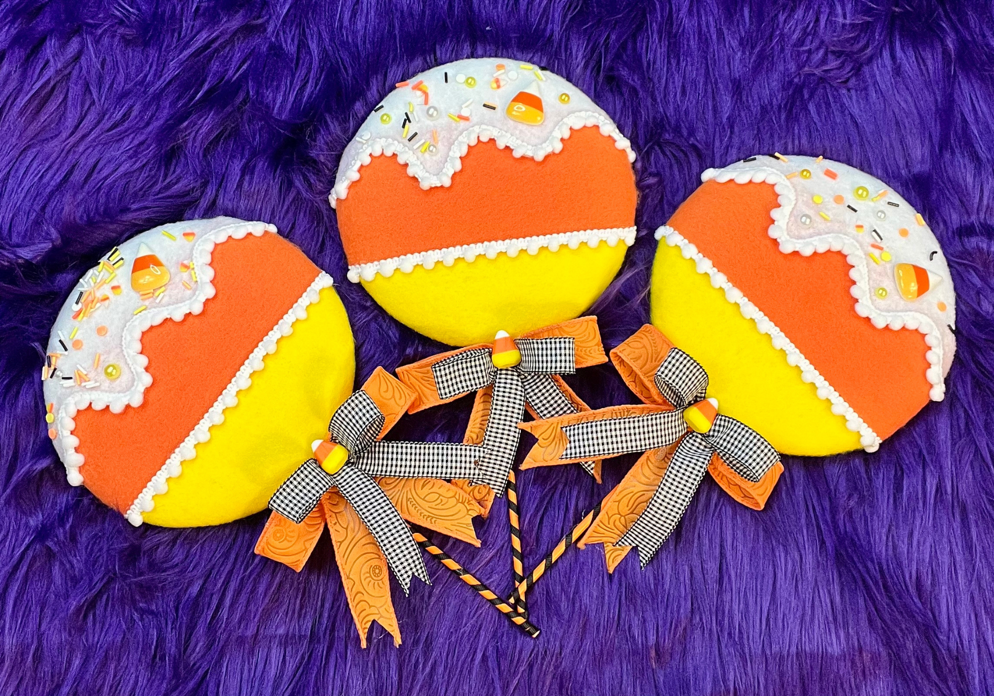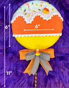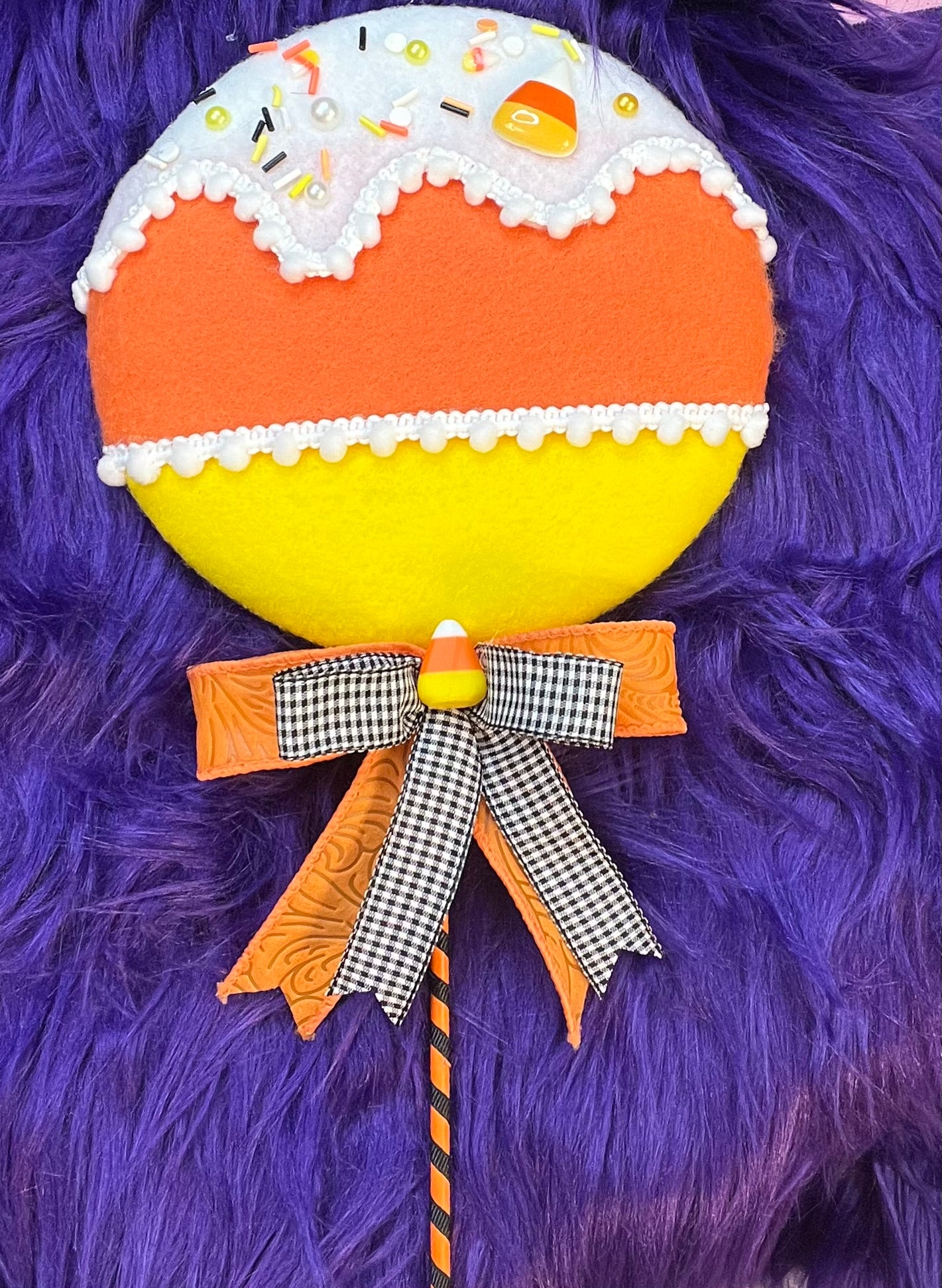 Add a pop of sweet Halloween charm to your wreaths, centerpieces, garlands, or DIY crafts with these handmade candy corn sucker attachments! Each one is crafted from soft felt and topped with “frosted” acrylic sprinkles, faux pearls, and festive pom-pom trim that gives it that sugary-fun, over-the-top look. Finished with a black-and-white check bow and an orange swirl ribbon, plus a tiny candy corn embellishment for that extra festive flair.