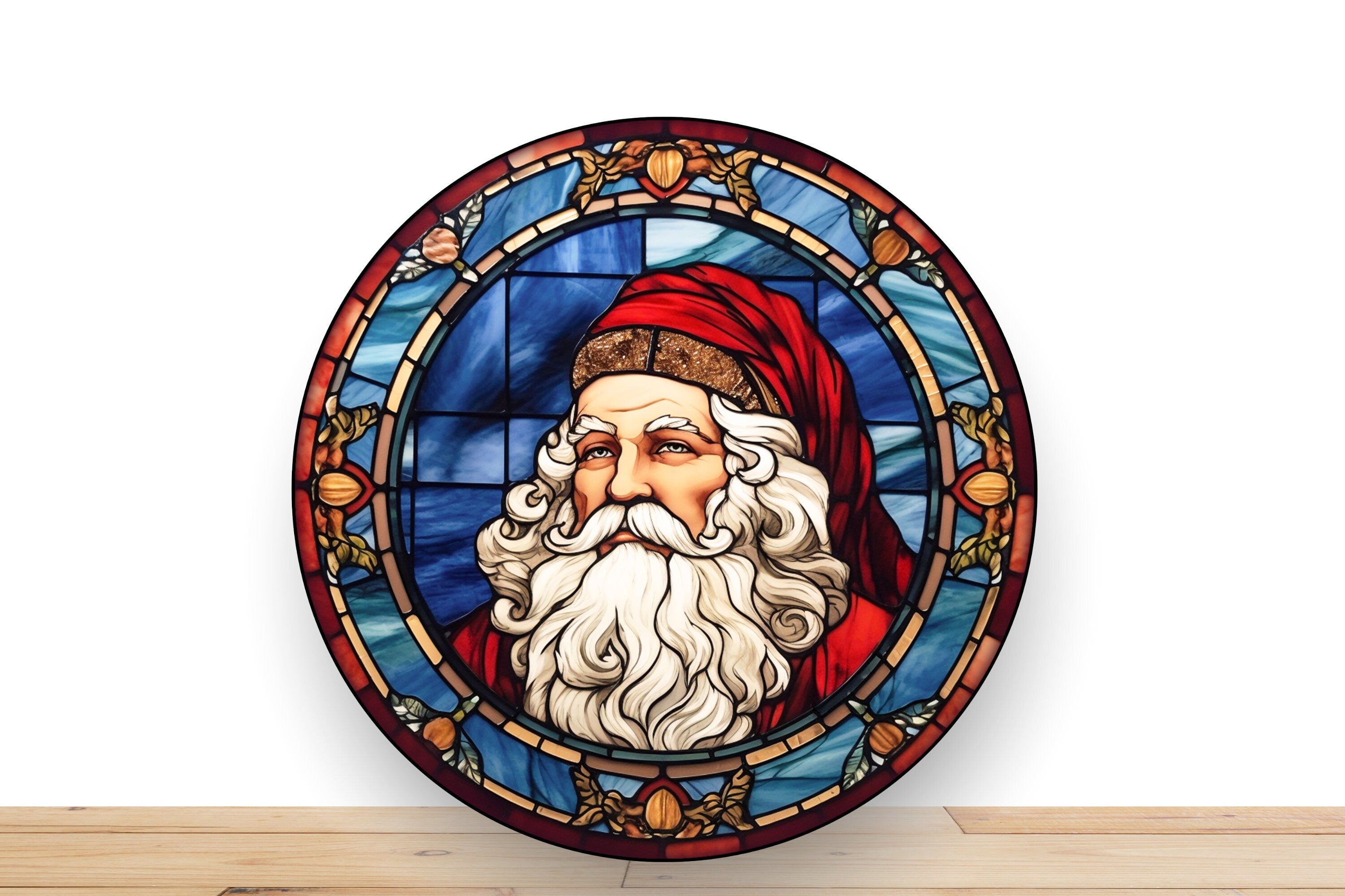 This exquisite wreath sign showcases a beautifully crafted Santa Claus portrait inspired by classic stained glass art. The design captures Santa's traditional look with his iconic red hat and flowing white beard, surrounded by intricate glasswork that adds depth and elegance. The vibrant colors and detailed pattern make this sign a perfect centerpiece for holiday decor, bringing a touch of old-world charm to your home.