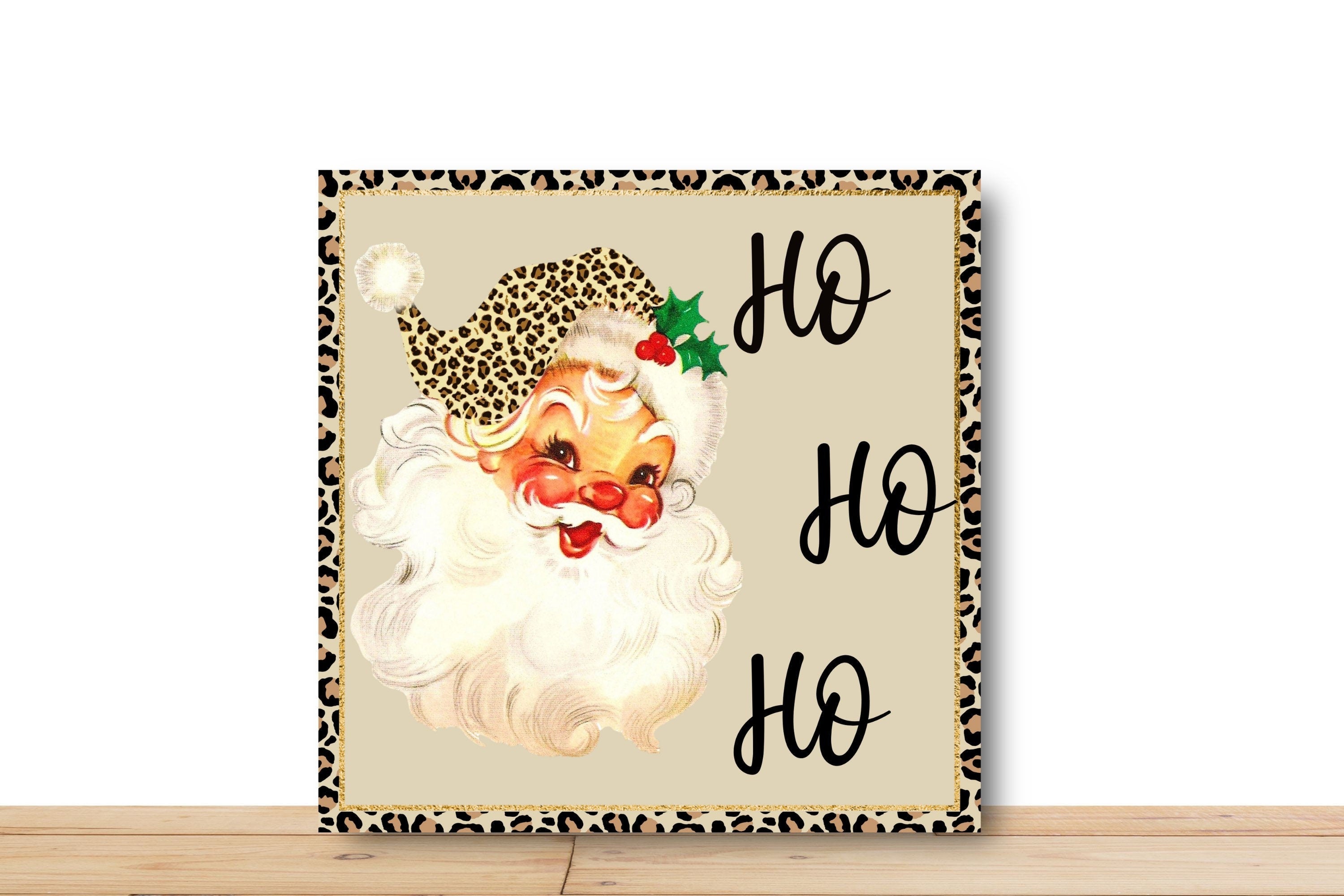 Add a dash of vintage charm and style to your holiday decor with this playful wreath sign featuring a classic Santa adorned in a trendy leopard print hat. Framed with a leopard print border and the cheerful "Ho Ho Ho" text, this sign brings a fun and retro twist to your Christmas decorations.