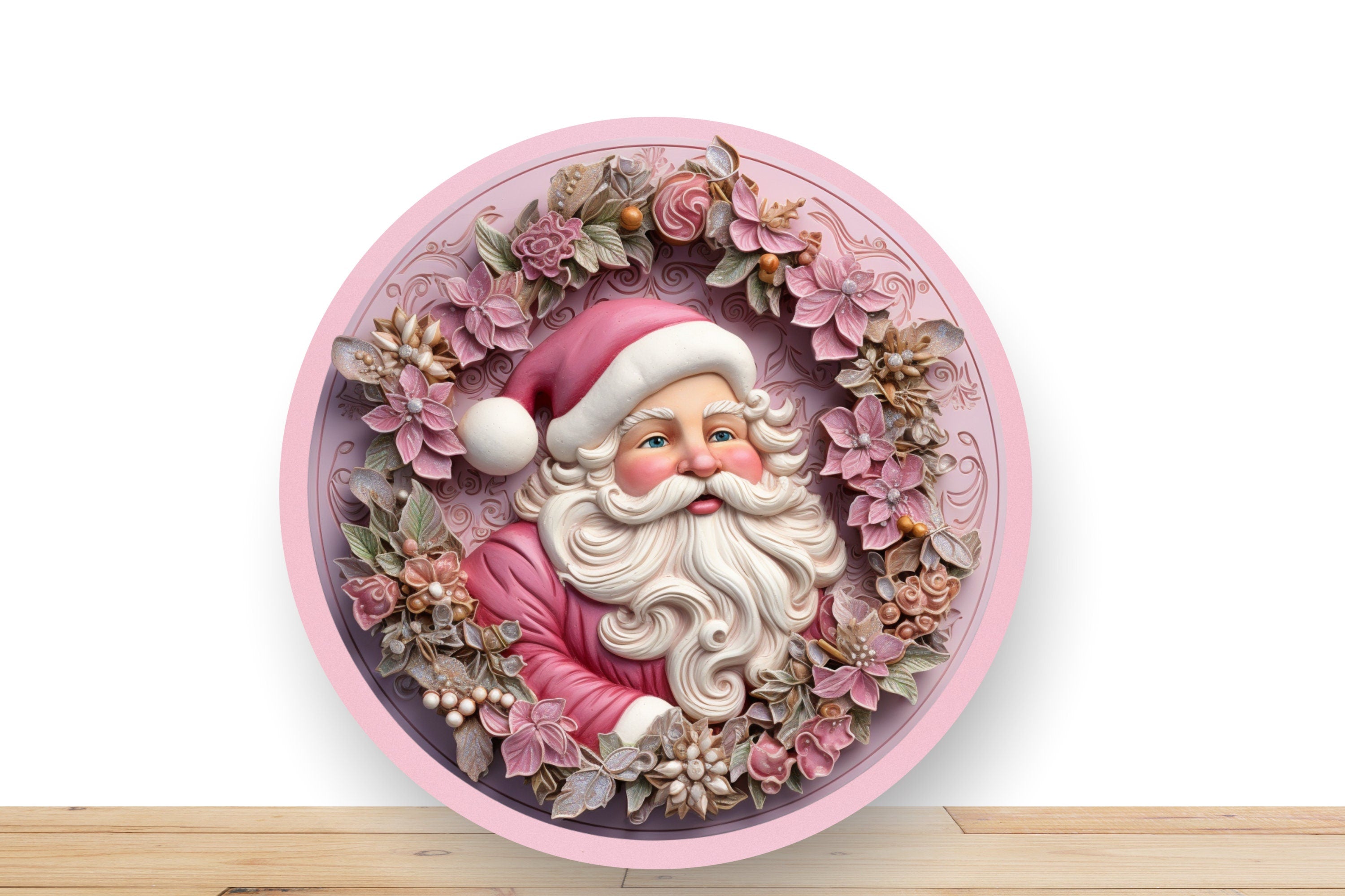 This festive Pink Santa wreath sign beautifully blends holiday tradition with a modern twist. Featuring a charming, rosy-cheeked Santa framed by delicate pink poinsettias and soft, frosted greenery, this design is perfect for adding a whimsical touch to your holiday décor. The intricate details and soft pastel hues offer a refreshing alternative to the classic red and green Christmas palette, making it a unique standout piece for your front door or wall.