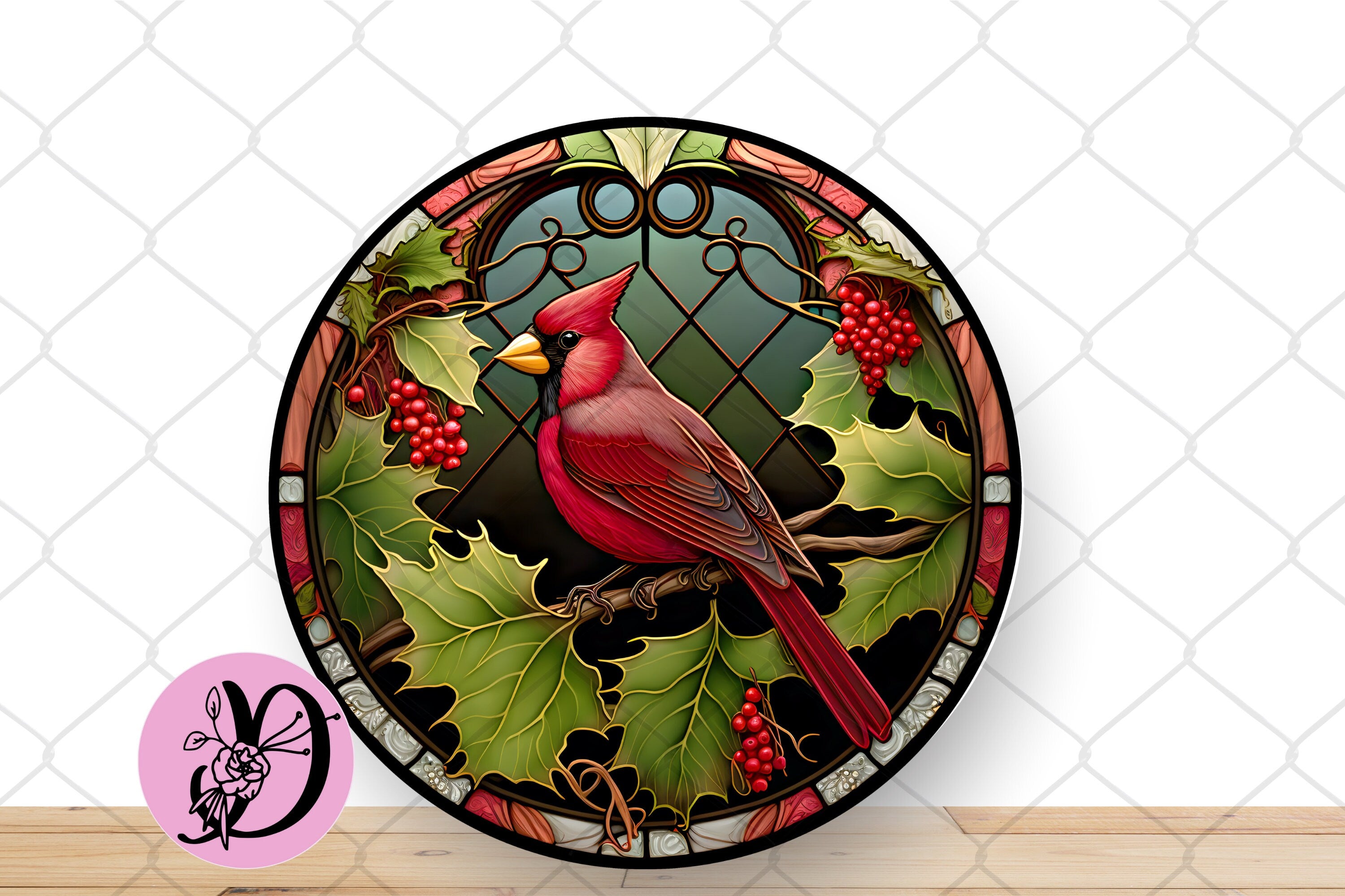 Illuminate your holiday decor with this exquisite faux stained glass-inspired wreath sign featuring a vibrant red cardinal surrounded by lush holly leaves and berries. The intricate design adds an elegant touch, perfect for celebrating the beauty of nature and the spirit of the season. Ideal for hanging on doors, or walls..
