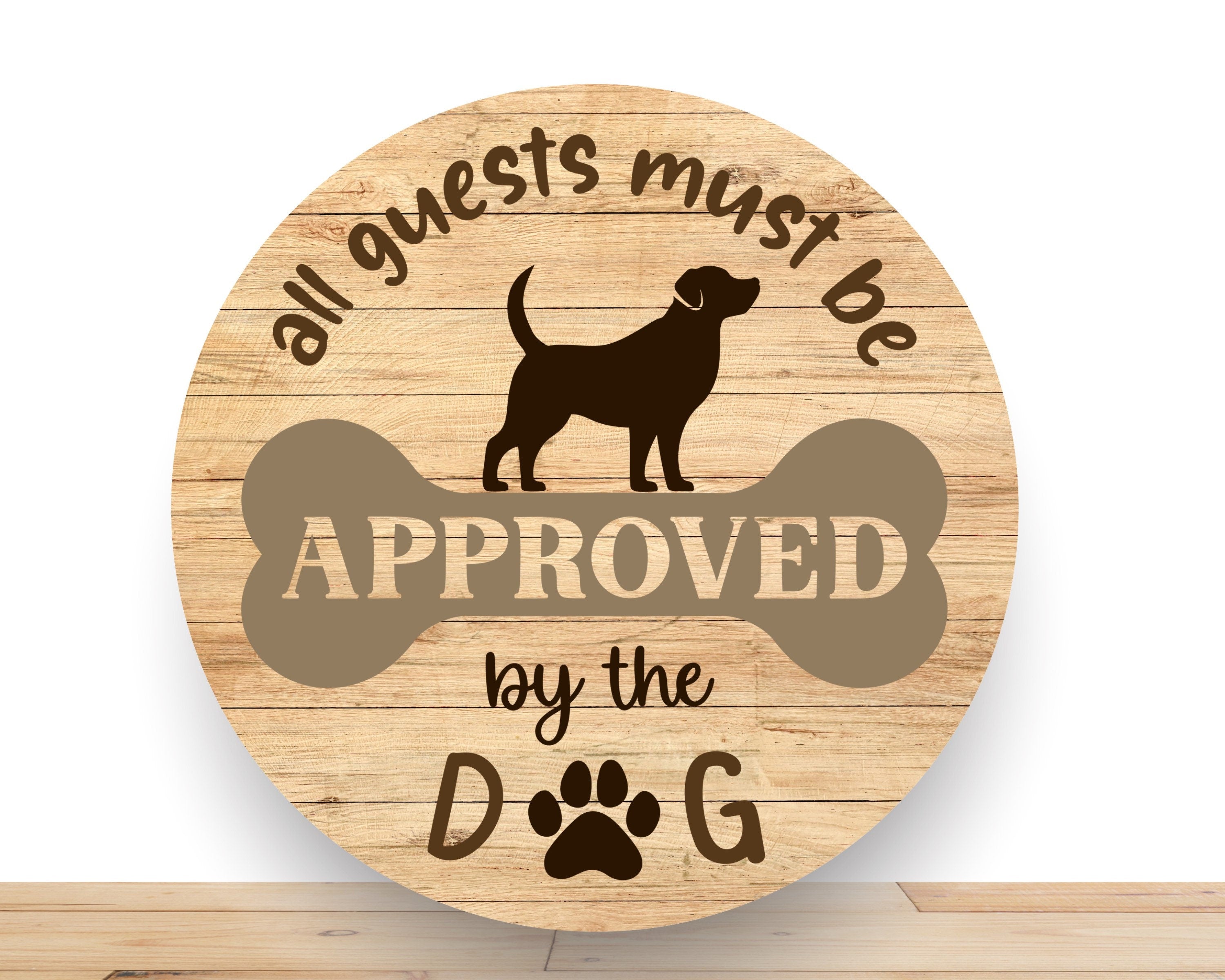 Welcome guests with a touch of humor and charm! This rustic wood-style wreath sign features a playful message that all visitors must be "Approved by the Dog," complete with a dog silhouette and paw print accents. Perfect for pet-friendly homes and dog lovers.