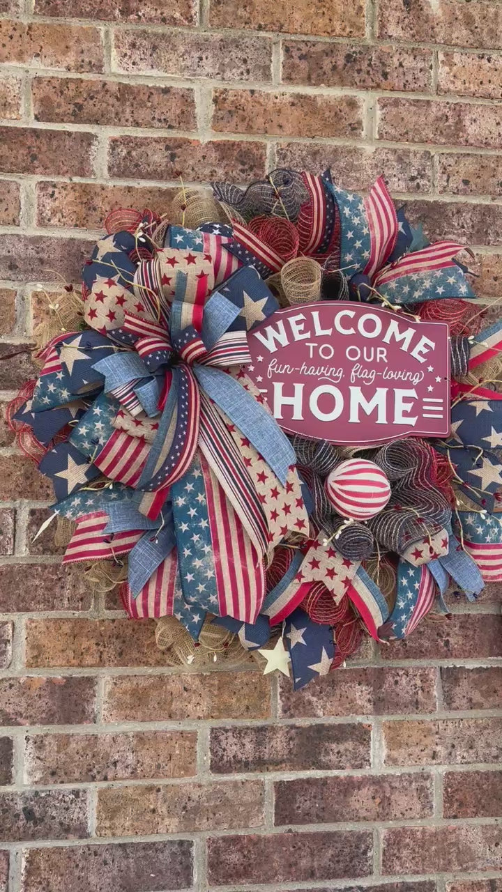 Celebrate freedom with flair! This bold and beautiful 27" Patriotic wreath is crafted on a sturdy evergreen base and bursting with red, white, and blue charm. Featuring layered ribbons with stars and stripes, burlap accents, and a standout sign that reads “Welcome to our fun-having, flag-loving home,” this wreath is perfect for Memorial Day, Fourth of July, or year-round Americana spirit. A warm and festive welcome for every proud American porch!