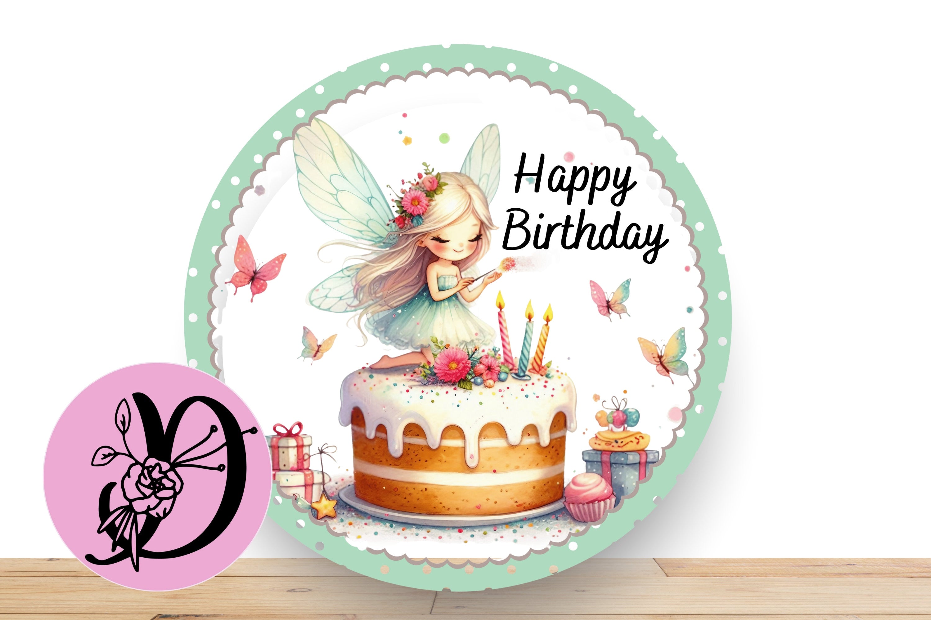 This enchanting "Happy Birthday" wreath sign features a charming fairy in a soft pastel dress sitting atop a delightful birthday cake. The fairy is surrounded by fluttering butterflies, beautifully wrapped presents, and glowing birthday candles. With its whimsical design and soft mint green border with delicate polka dots, this sign is perfect for creating a magical and festive atmosphere for birthday celebrations.