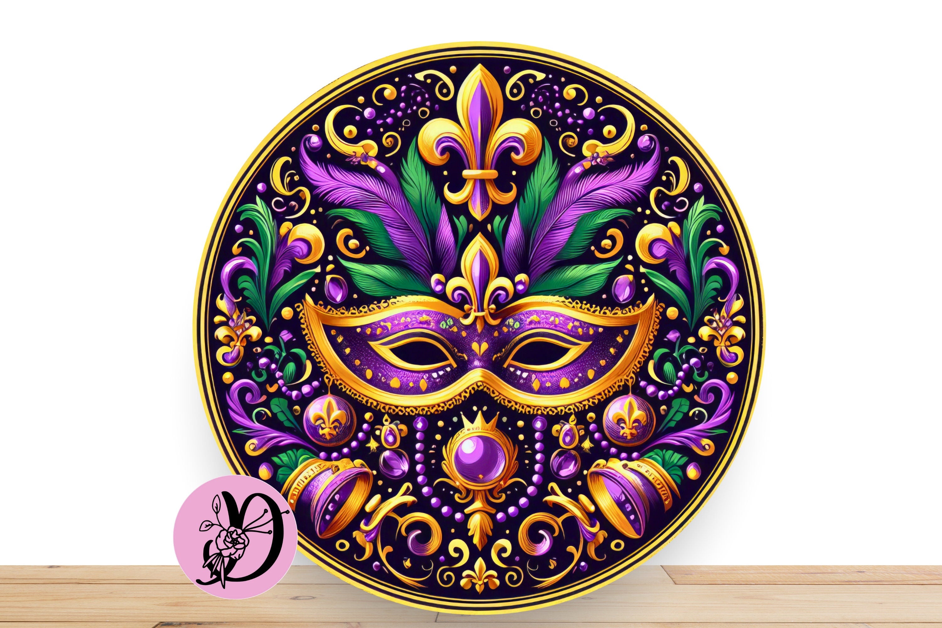 Celebrate the vibrant spirit of Mardi Gras with this stunning wreath sign featuring a purple and gold masquerade mask, fleur-de-lis accents, and festive beads. Perfect for doors, walls, or party decor, this sign brings the essence of New Orleans to your space.