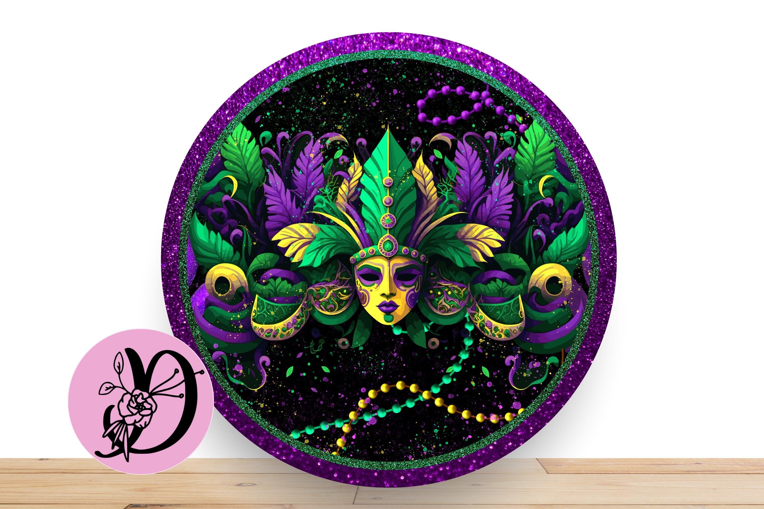 Bring the energy and glamour of Mardi Gras to your home with this bold wreath sign featuring a dazzling mask, rich purple, green, and gold feathers, and festive beads. Perfect for party decorations or year-round New Orleans flair.
