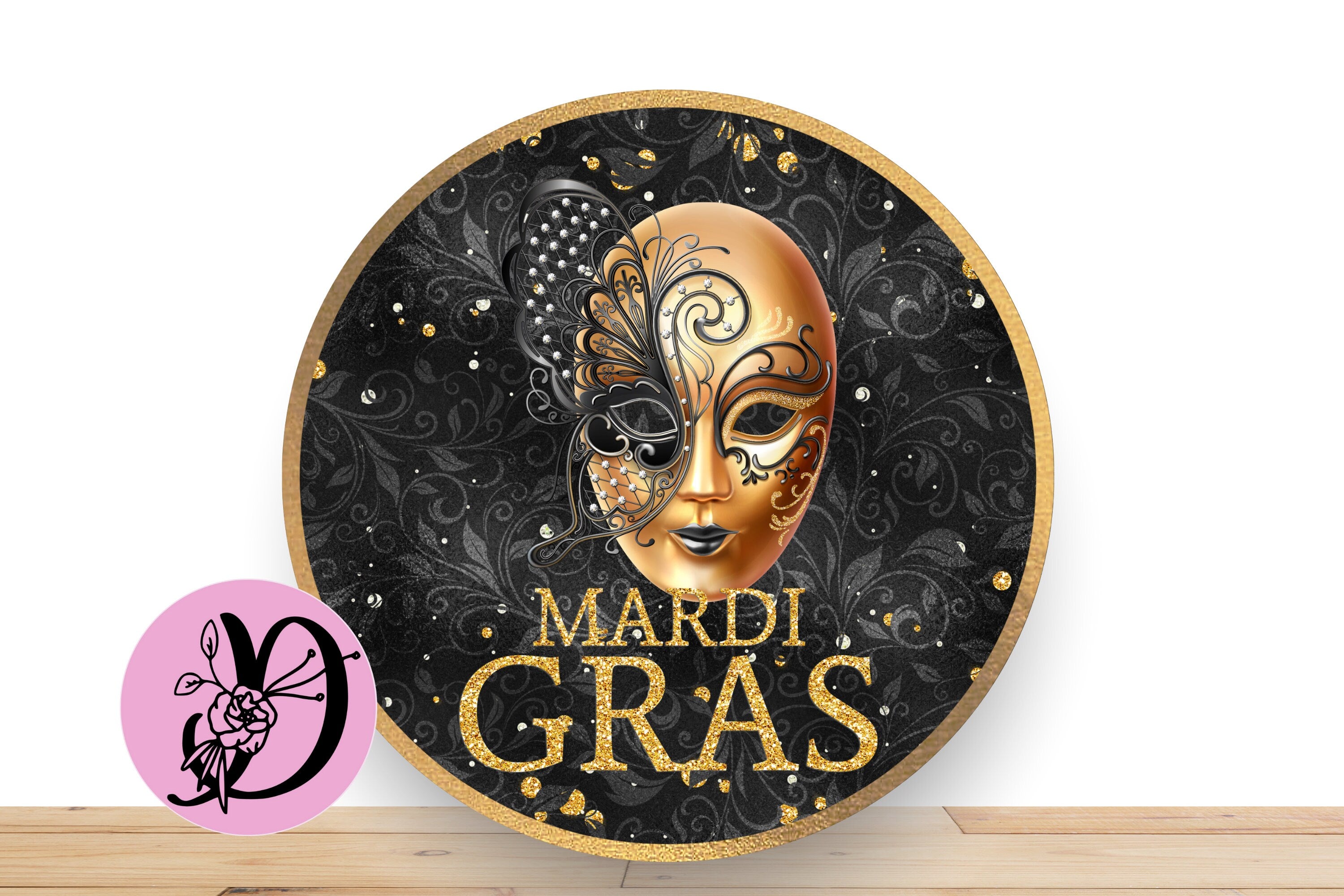 Celebrate Mardi Gras in style with this stunning black and gold wreath sign featuring a sophisticated mask design and glittering accents. Perfect for adding a festive and luxurious touch to your Mardi Gras party decor, front door, or home decorations. Let the good times roll with this eye-catching piece!