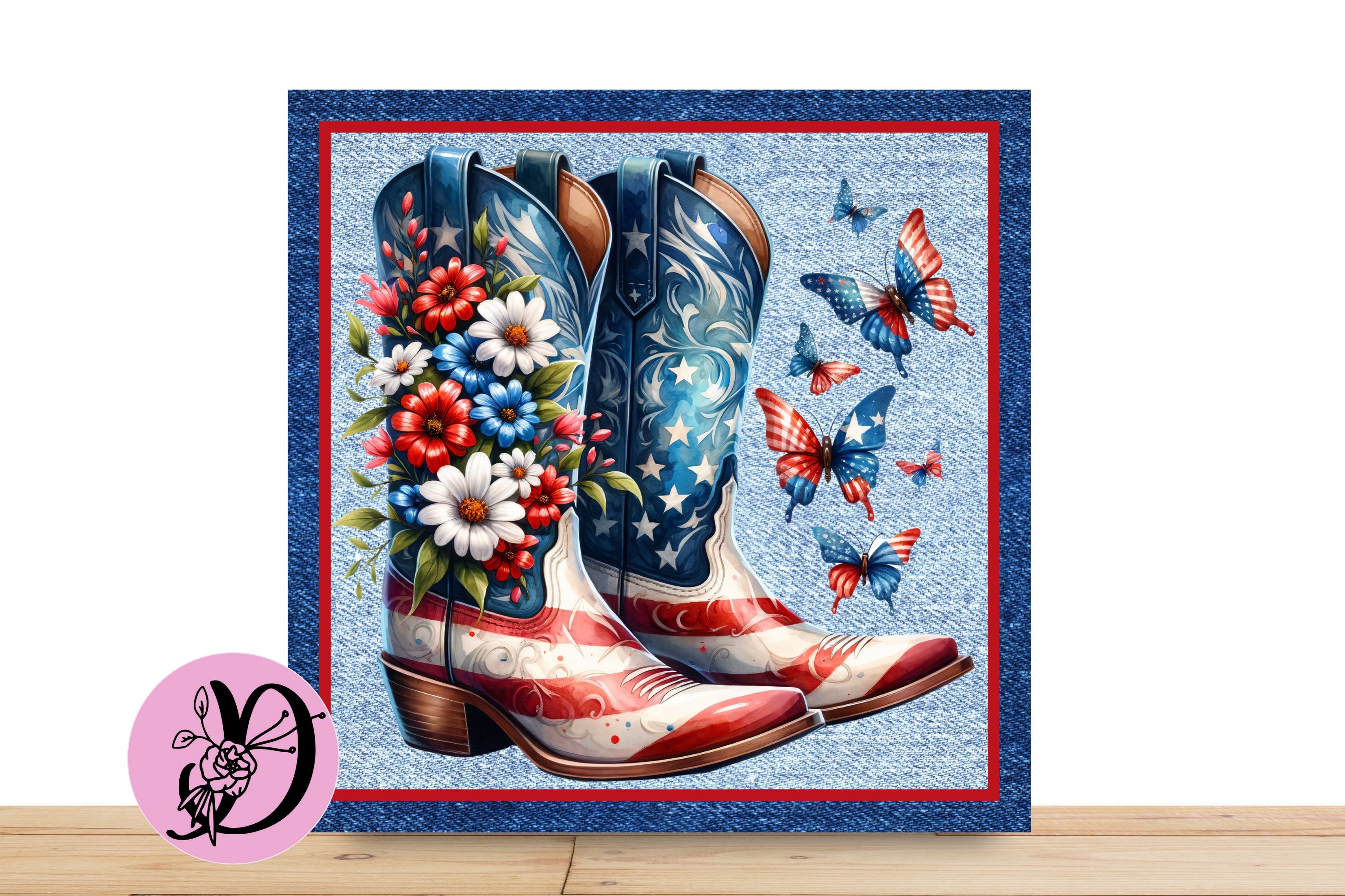 Add a touch of Americana charm to your home with this patriotic wreath sign. Featuring cowboy boots adorned with stars, stripes, and vibrant red, white, and blue flowers, set against a denim-inspired backdrop with fluttering patriotic butterflies. Perfect for showcasing your love for the USA.