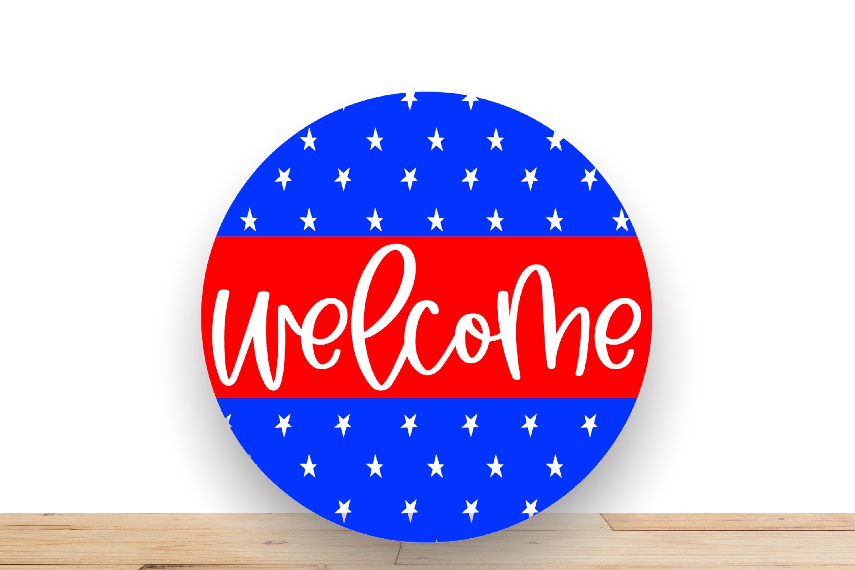 Make a striking statement with this vibrant red and blue "Welcome" wreath sign. Featuring bold colors and star accents, it's the perfect addition to patriotic decor or year-round charm for your front door.