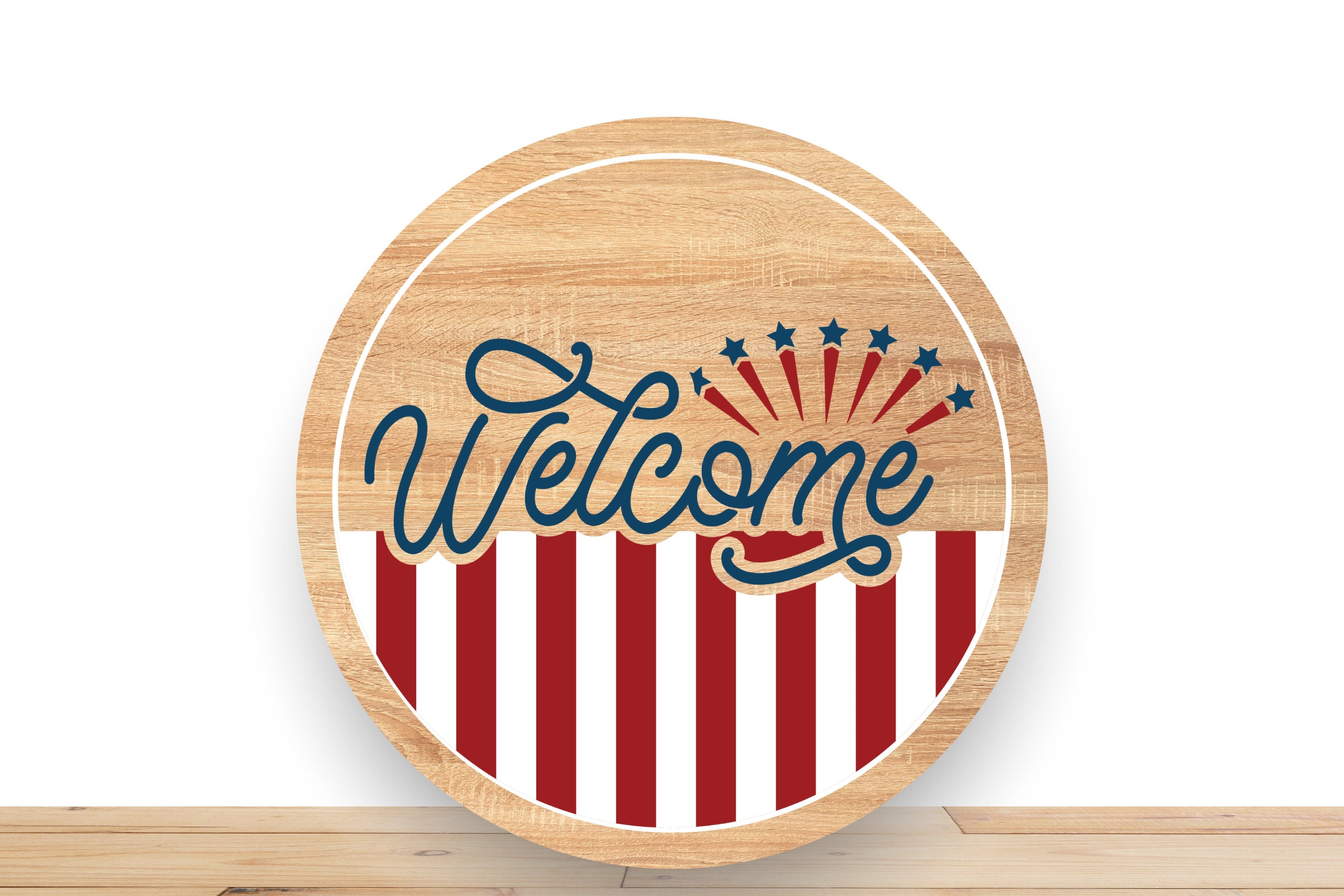 Celebrate America with this charming "Welcome" wreath sign, featuring a rustic wood background, festive red and white stripes, and patriotic fireworks bursting with stars. A perfect addition to your front door decor for Fourth of July or year-round Americana charm.