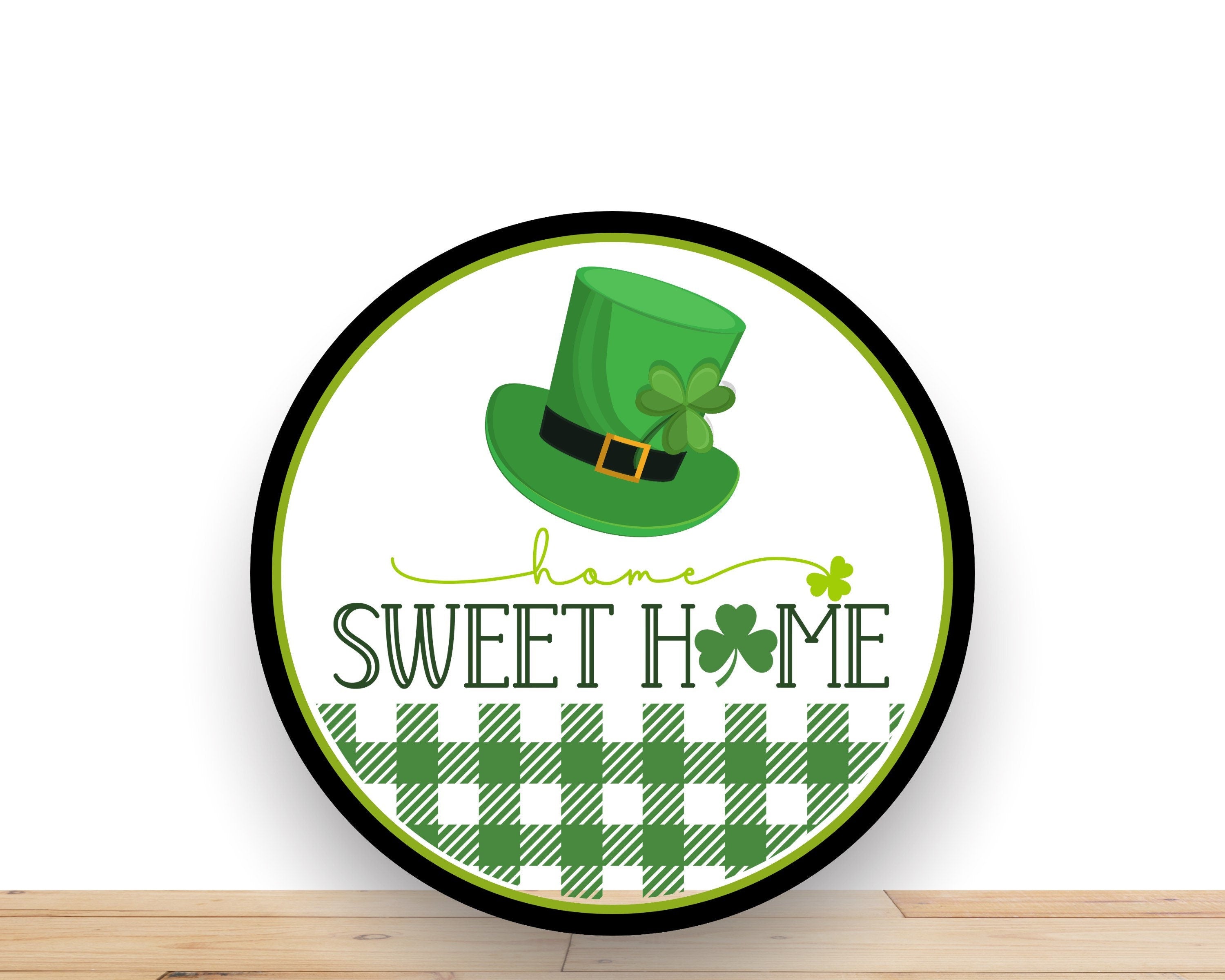 Bring Irish charm to your home with this "Home Sweet Home" St. Patrick’s Day wreath sign. Featuring a playful leprechaun hat, shamrocks, and a green buffalo plaid pattern, this round sign is perfect for welcoming guests with festive flair.
